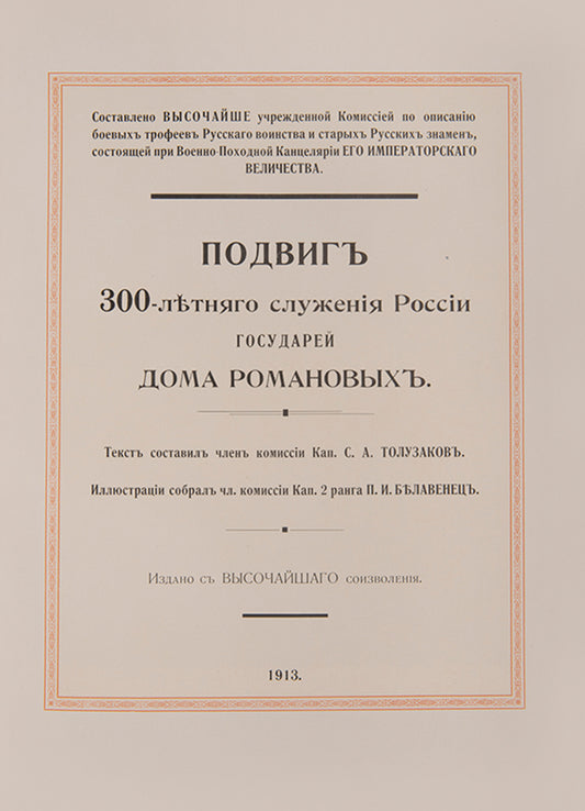 Podvig 300-letnego sluzheniia Rossii Gosudarei Doma Romanovykh [The feat of 300 year service to Russia of the sovereign House of Romanov].