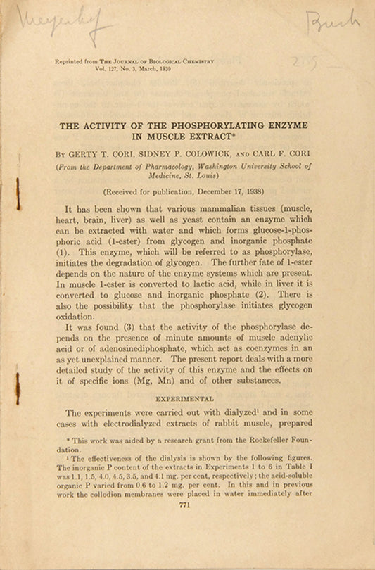 'The Activating Effect of Glycogen on the Enzymatic Synthesis of Glycogen from the Glucose-1-Phosphate', November 1939, [with]