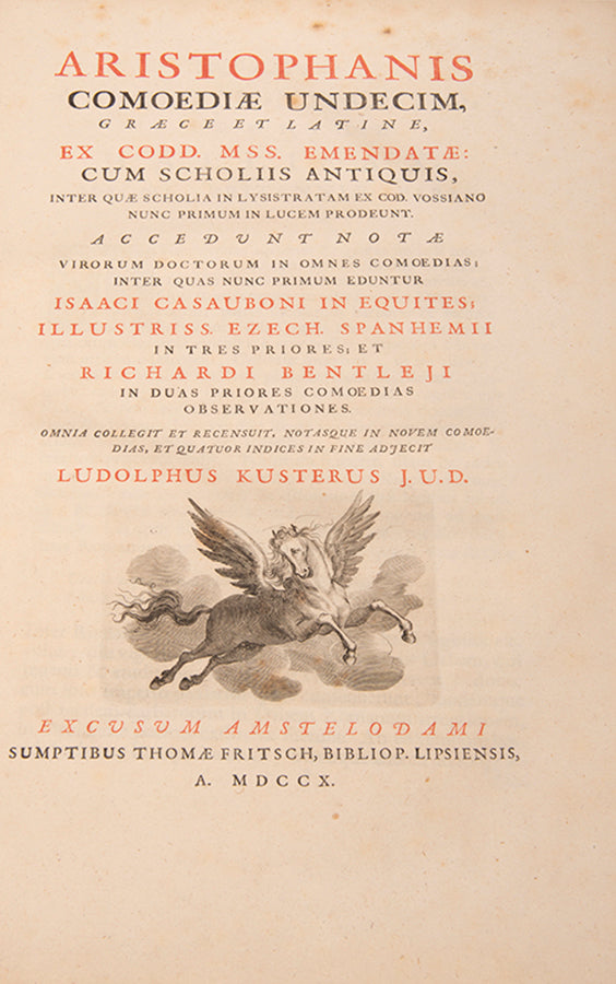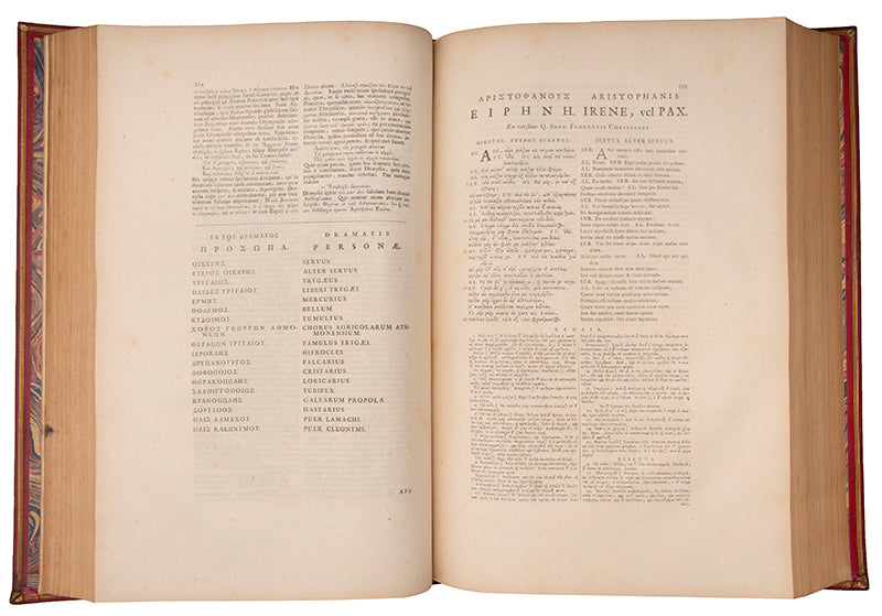 'This excellent edition, emphatically called Editio optima, contains for the first time, some new Scholia on the Lysistrata; some notes of Isaac Casaubon on the Equites; and of Spanheim and Bentley on a few other plays. [...] The animadversions and commentaries of many learned men adorn this edition...' (Dibdin, pp299-300).