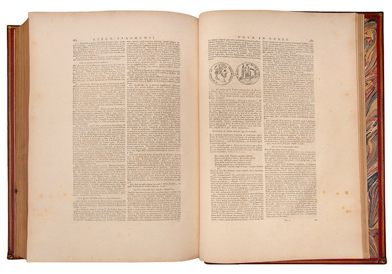 2 parts in one, folio (43.6 x 30 cm); text in Greek and Latin, title printed in red and black, engraved device of a Pegasus to title, engraved initials in first part, decorative head- and tailpieces, four small engravings in the second part, some foxing, slight age-toning; 19th-century red morocco by John Clarke, in 18th-century style, borders beautifully decorated with an elaborate gilt design, inner dentelles gilt, spine with six raised bands, elaborately gilt in compartments, gilt lettering to second and seventh compartments, minor spotting and scuffing to covers, corners slightly rubbed, all edges gilt, marbled endpapers, an attractive copy; [12], xxviii, 580; 324, [60]pp.