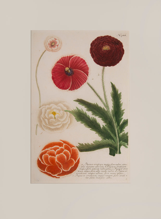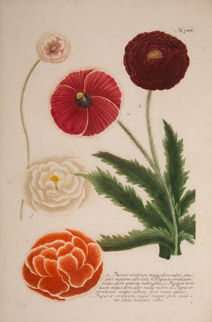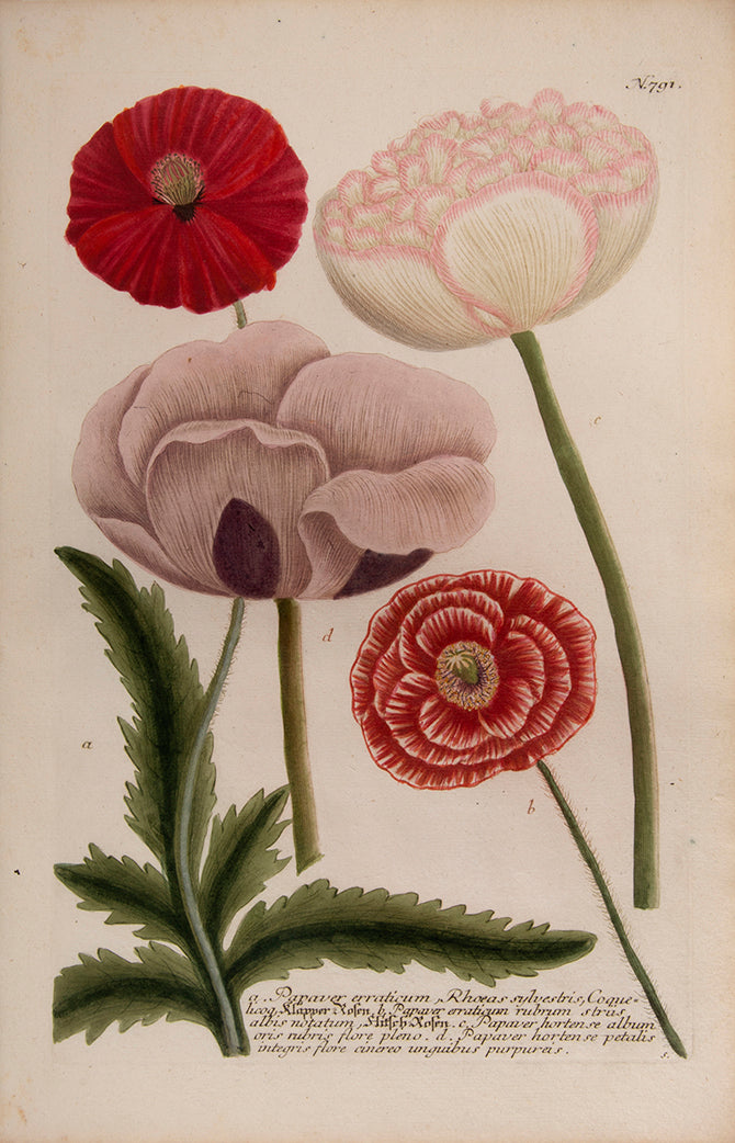 Johann Weinmann (1683-1741) was a Regensburg apothecary who organized the publication of Phytanthoza Iconographia, a huge florilegum which was not only very beautiful but which also influenced the publication of similar works worldwide. "The mezzotint process used here had been invented by Johann Teyler in the Netherlands around 1688. As practiced here by Bartholomaus Seuter (1678-1754) and Johann Elias Ridinger (1698-1767), it was really a combination of etching and mezzotint, which made possible delicate lines and a very fine grain. The addition of hand-tinting brought about unusual and subtle effects" (Hunt).
