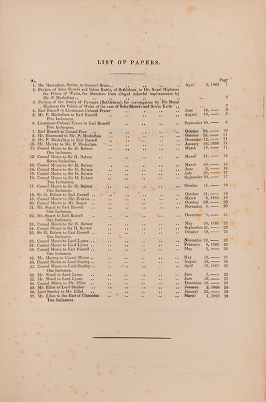 Correspondence respecting the murder of Mr. Peter Meshullam, and the removal of Mr. Finn from the consulate at Jerusalem.