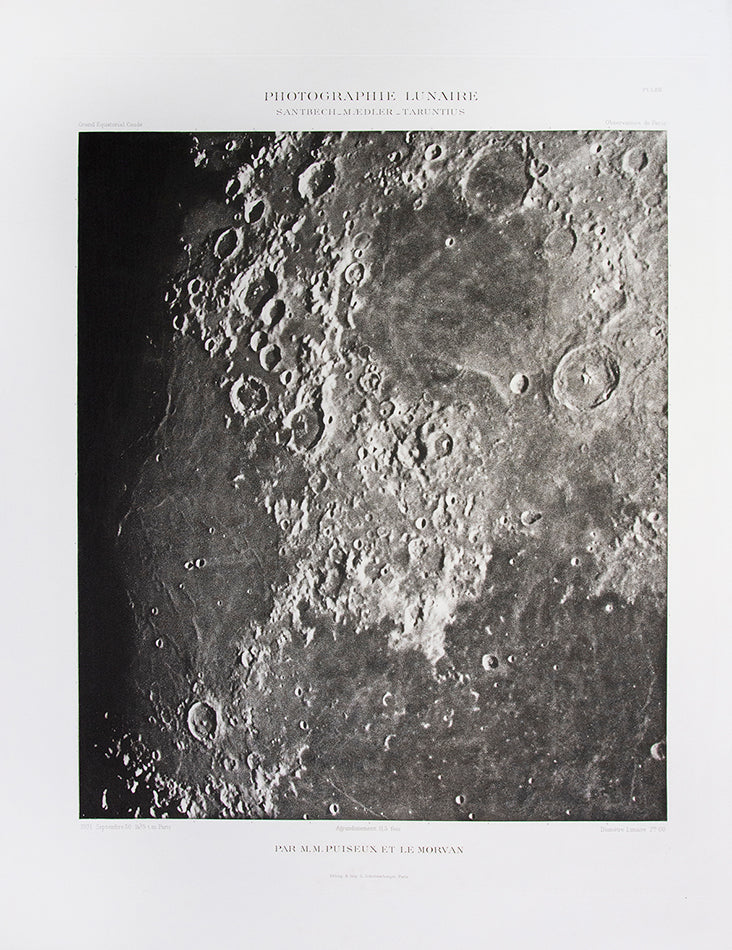 Moritz Loewy (1833-1907) and Pierre-Henri Puiseux (1855-1928), assisted by Charles Morvan, undertook a project to make a complete series of detailed photographs of the moon and the lunar surface. The two astronomers devoted approximately 500 evenings to observations in order to make more than 6,000 photographs of the moon. Their very best images were then published in L'Atlas photographique de la Lune. This was issued in fascicles from 1896 and 1910 by the Observatory of Paris, the atlas represents the best and most complete overview of the work of Loewy and Puiseux.