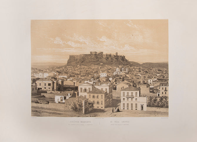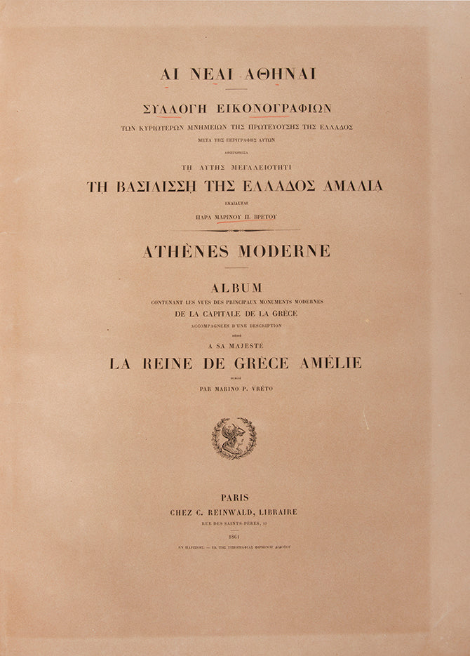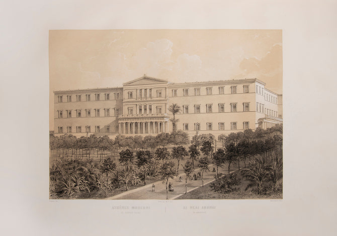 An incredibly rare book which celebrates how Athens had flourished in the twenty-five years since the seat of government had moved from Nafplio. The author Marinos Vretos (1828- 1877), was a writer, journalist and son of the Ionian Academy's librarian, Andreas Vretos. He writes how when the King and his retinue had first arrived, the port of Piraeus was nothing but a beach, causing their boats to run aground. Now, however, it was a flourishing hub on the Saronic Gulf and the envy of any European city. The Royal Palace is also described in glowing terms, an imposing building surrounded by rare and magnificent plants, sourced from all corners of the Orient where before there had been simply dust and rocks.