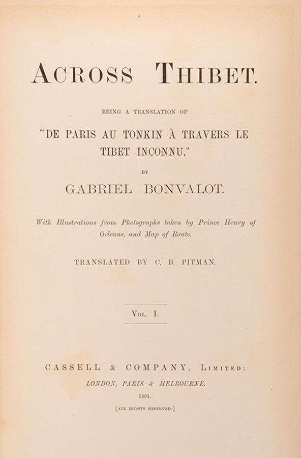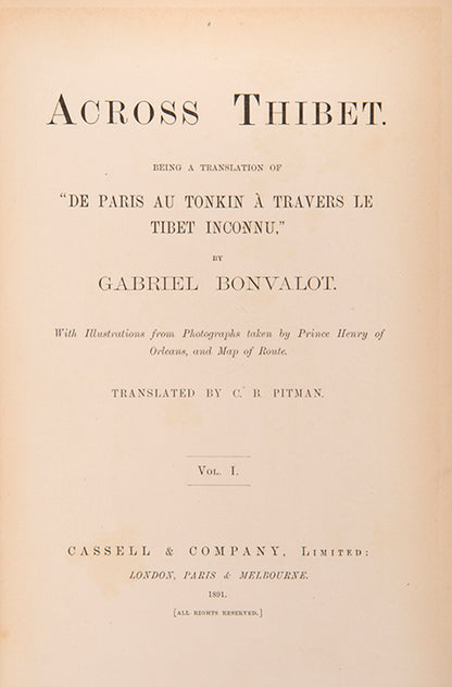Scarce in original cloth. Narrative of the journey with Henri d'Orleans from Jarkent to Chamdo through the Tien Shan and Tibet in the winter of 1889-90.