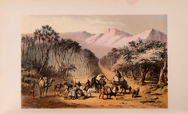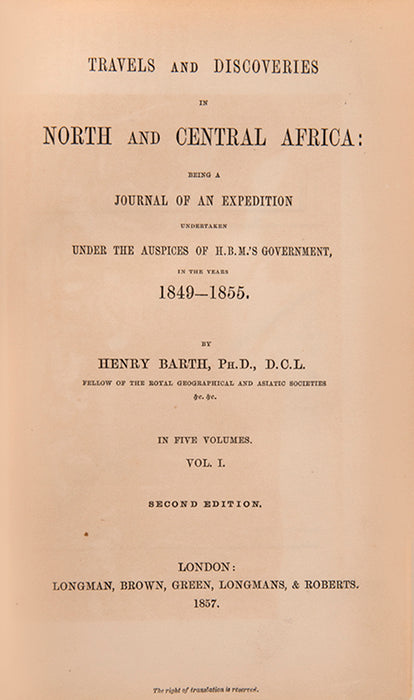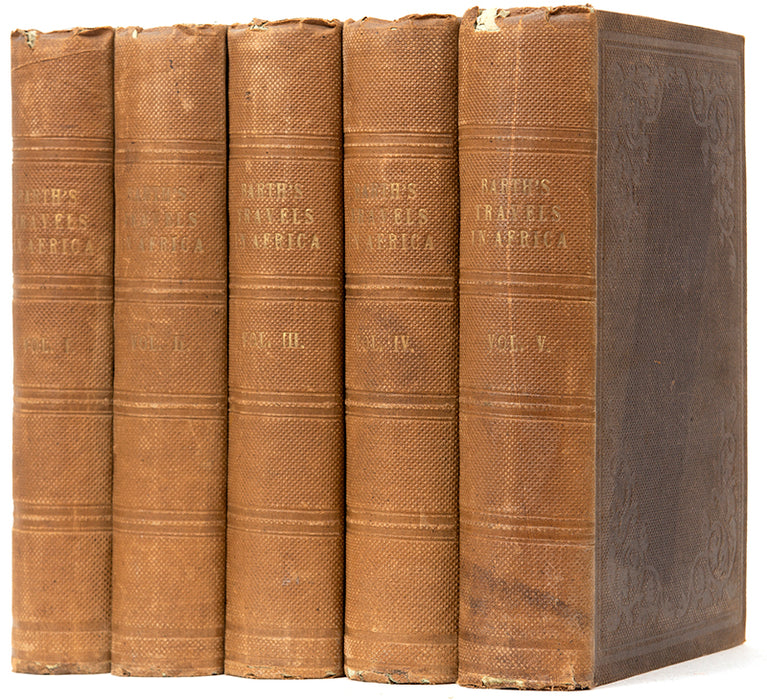 Barth's five-volume work, published simultaneously in German and English, remains the most scientific publication of its time on the African cultures he encountered. Beyond their compelling narratives, the volumes present more than a dozen detailed maps and several dozen illuminating illustrations. Their appendices contain tables of meteorological data for his five years of travel, chronologies of history for certain areas, vocabularies, descriptions of routes, and lists of towns.' (John Delaney, To the Mountains of the Moon).