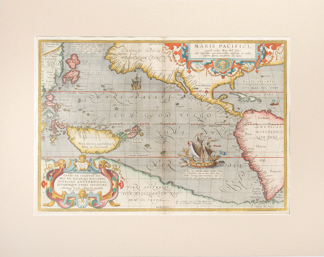 Pacific Ocean. Well-preserved example of Ortelius' map of the Pacific, taken from the fifth, final, and most complete French edition of Theatre de l'Univers. Enriched with decorative cartouches and ships.