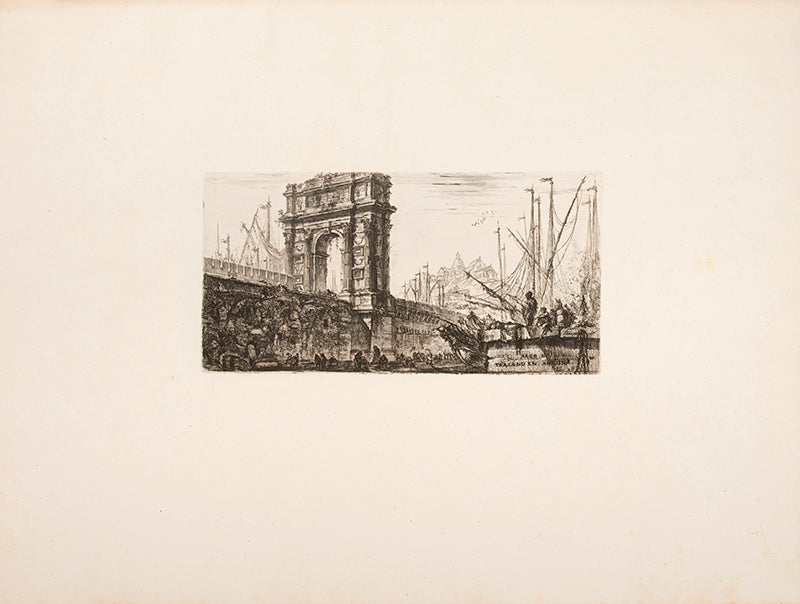 Four works bound in 1 vol.; folio (56 x 42 cm); bookplates (one partially erased) and ownership inscription in pen to front pastedown, MS title on vellum tipped-in to foot of front pastedown; [Opere] second edition, second issue, title in red and black with engraved vignette (Robison second issue), 10 plates on 5 sheets (Wilton-Ely 45-50) bound after Prima Parte, second edition, second issue, engraved frontispiece (Robison fourth state) and 16 plates (complete), 2 unnumbered double-page plates (later versions of the 1781 issue of these plates have numbers added (see Hind p.81): Pianta di ampio magnifico Collegio (Robison 25, third state), and Parte di ampio magnifico Porto (Robison 26, fourth state), Grotteschi, second/third states (Robison 21-24), 4 double-page plates; [Carceri] second edition, second issue, double-page engraved title and 15 double-page plates (numbered II-XVI); [Trofei] first edition. Rome: G. G. Salmoni, 1753, title in red and black with engraved vignette, 8 (of 9) unnumbered plates, 4 double-page, lacking one plate (the view of the Castello, title slightly spotted; [Antichita] first edition (1748). 30 engraved plates (including title, dedication, and 2 plates of inscriptions);contemporary half vellum, marbled boards, edges sprinkled red, minor repairs, slightly rubbed, very good.