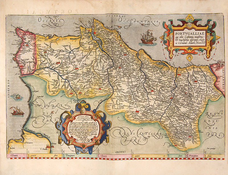 Well-preserved example of Ortelius' map of Portugal. Taken from the fifth, final, and most complete French edition of Theatre de l'Univers. Enriched with decorative cartouches and ships.Abraham Ortelius (1527-1598) was a cartographer and publisher, he was born and died in Antwerp.