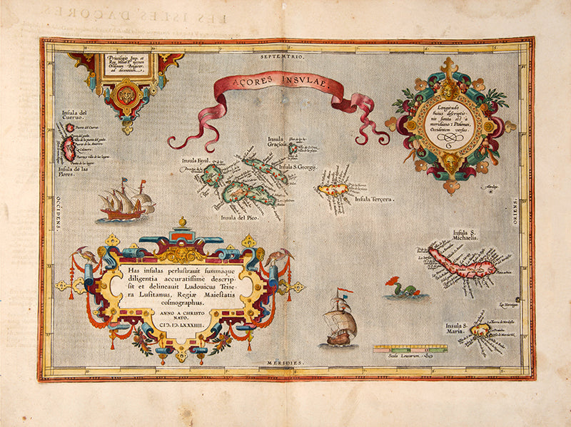 Well-preserved example of Ortelius' map of the Azores. Taken from the fifth, final, and most complete French edition of Theatre de l'Univers. Enriched with decorative cartouches and ships.