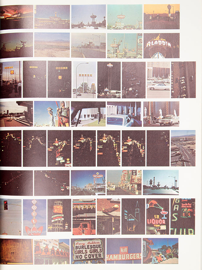 Learning from Las Vegas is compiled from research materials gathered in 1968 by students of a third-year graduate class at Yale School of Architecture, taught by Robert Venturi, Denise Scott Brown, and Steven Izenour. The class Learning from Las Vegas, or Form Analysis as Design Research, required the students to make a nonjudgemental study of the city and how it functioned, and their research was documented through photographs, films, maps, and diagrams. Muriel Cooper was tasked with translating the diverse materials from the studio into a book, initially planning for the book to be protected by a bubble wrap dust-jacket, with fluorescent dots on the boards.