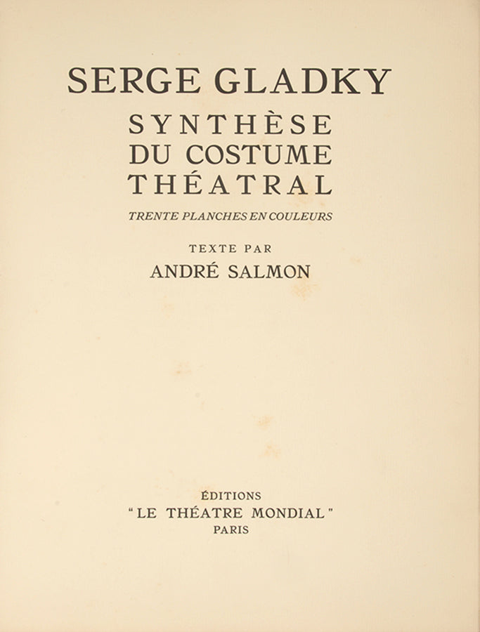 The album's preface is by the poet, novelist and art critic André Salmon (1881-1969) who, together with his close friends Pablo Picasso and Guillaume Apollinaire, was one of the early proponents of Cubism. Salmon calls Gladky's plates 'inventions merveilles, miraculeuses', praising the artist's ability to capture the essence of Russian culture through geometric forms: 'Oh! je sais; la révolution cubiste de 1906 a facilité la tâche de M. Serge Gladky. Sachant de ce cubisme tout ce qu'on peut en connaître, j'admire d'autant plus l'artiste russe d'en avoir su recevoir tout ce qui lui permet de recréer, dans le temps et l'espace, dans l'heure et dans l'éternel, sa lointaine patrie, composant des costumes qui sont autant d'absolus décoratifs'.