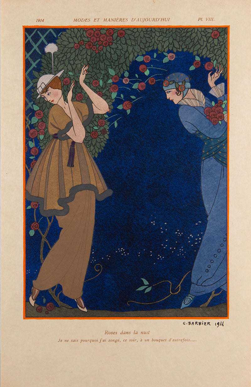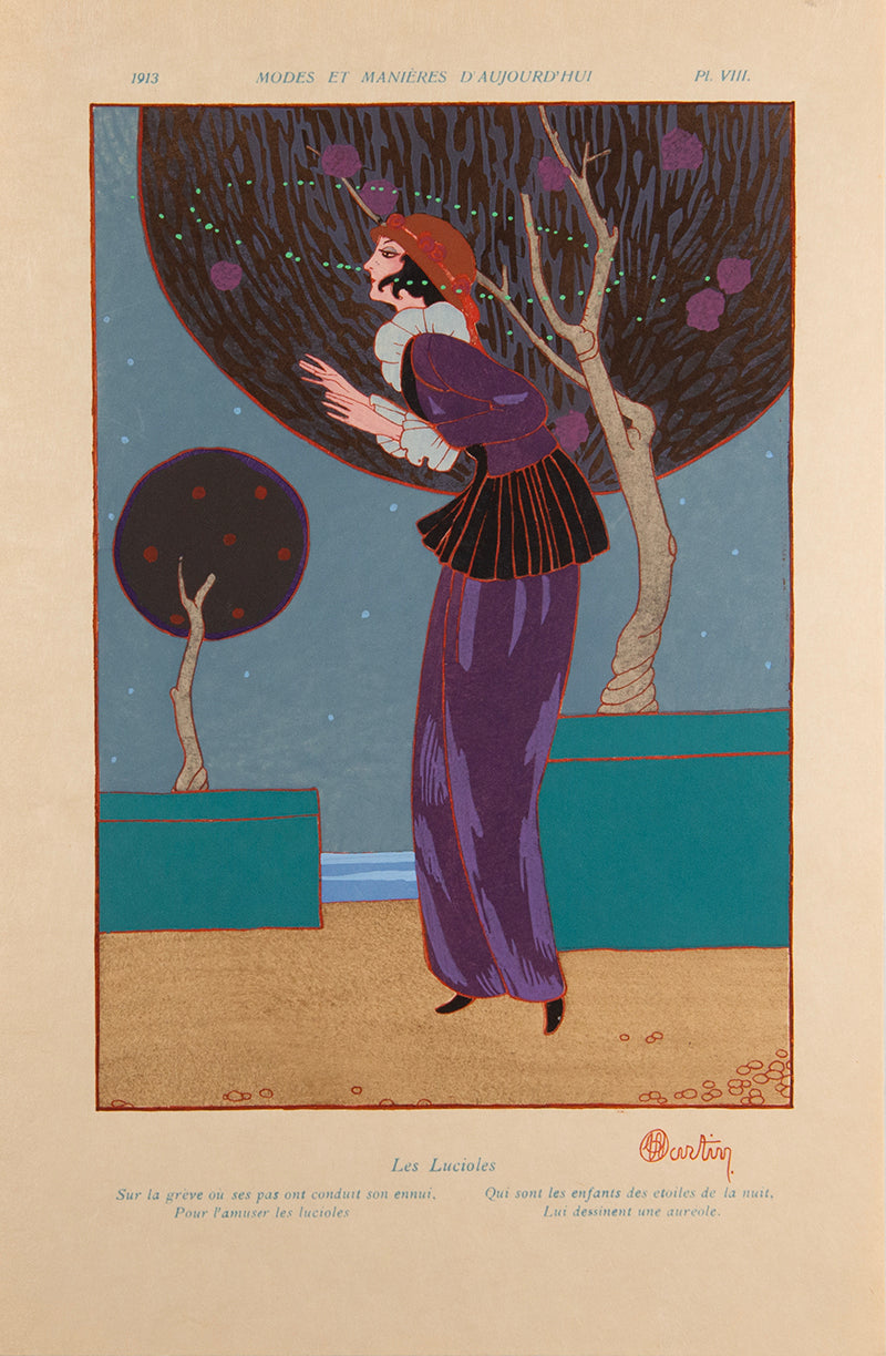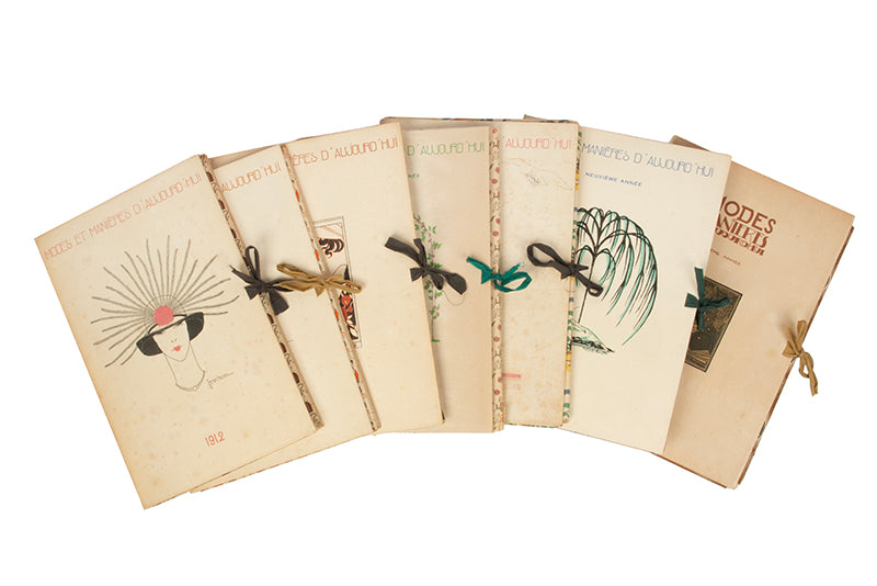 Complete set of seven volumes of Modes et Manières in the original portfolios, with 84 plates in total. A fine bright copy of an Art Deco landmark. Two of the issues (numbers 2 and 4) are from the smaller edition with an original signed drawing, one by Lepape and one by Martin.7 issues (complete), 8vo; all issues a total edition of 300, issue no.1, one of 271 copies on Japon (no.276), 12 plates after Lepape, initialled in pencil by Lepape and Corard on the justification; issue no. 2, one of 17 copies with an original 'remarque' on Japon (no.27), original signed in pencil by Lepape, creased in the bottom corner, 12 plates after Charles Martin, signed by Martin on the justification; issue no. 3, one of 271 copies on Japon (no. 139), initialled by Barbier on the justifcation, 12 plates after Barbier; issue no.4, one of 17 with an original 'remarque' on Japon (no.20), original drawing with silver, monogrammed by Charles Martin, 12 plates after Lepape; issue no. 5, one of 271 copies on Japon (no.113), 12 plates after Andre Marty; issue no. 6, one of 271 copies on vélin d'arches (no. 74); 12 plates after Robert Bonfils; issue no. 7, one of 271 copies on vélin de cuve (no.76), 12 plates by Fernand Siméon; all loose as issued in the original portfolios with patterned paper folding paper internally, each issue with a illustration on the upper by the corresponding artist, some issues with some spotting to covers, no. 4 with split spine, no. 6 lacking one tie, housed in a modern red cloth box with brown morocco label to spine, a very good set.