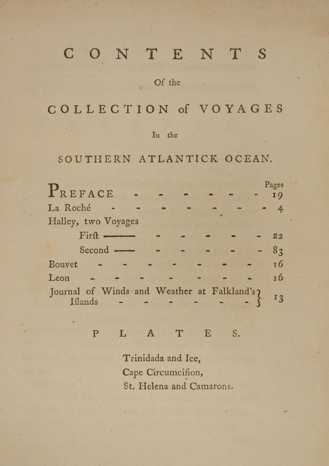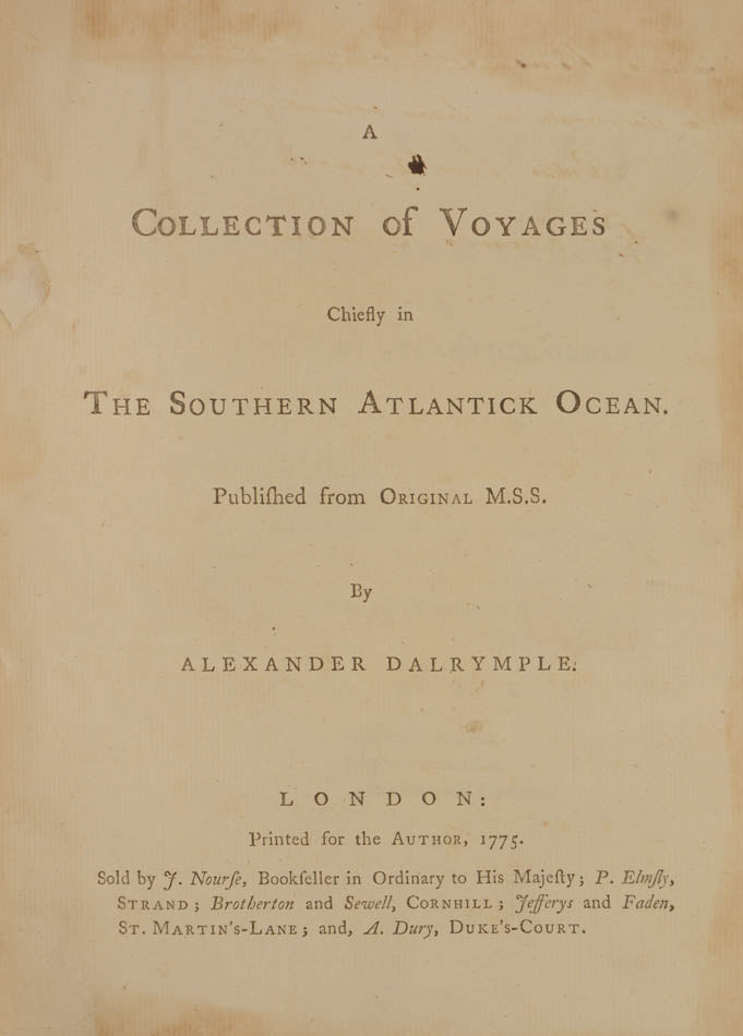 The volume contains in its preface Dalrymple's appeal to Lord North to allow him official approval to make a voyage of discovery in the South Atlantic to investigate the reports of Halley, Bouvet, La Roche, and Leon, and to search for and establish a colony at Halley's Cape Circumcision. There is a most interesting section which contains a surprisingly modern constitution for the new colony: 1. '...there shall be a Tax of Batchelors or Maidens possessing lands and houses... which shall go the maintenance of orphans...'; 2. 'No coin but Copper Money as in China and accounts kept in decimals'; 3. 'Women are not debarred from public office, but may enjoy their rights in the public assembly on the same footing as men'; 4. 'No Person shall exercise the Profession of Law, by counsel or otherwise, for hire or fee, on penalty of forfeiture of all his property and perpetual imprisonment'; 5. 'No person to be imprisoned for debt, or for any offence, but such as make their being left at liberty dangerous to society'. Dalrymple had intended to expand the work further, but decided to collect such articles as he had assembled on the subject, for he was about to set sail for India. The various accounts contained within the book are printed in different places (for example, the Extrait du Voyage is obviously of French origin, while Dalrymple's brother, James, saw the Lyon journal through the press in Scotland).