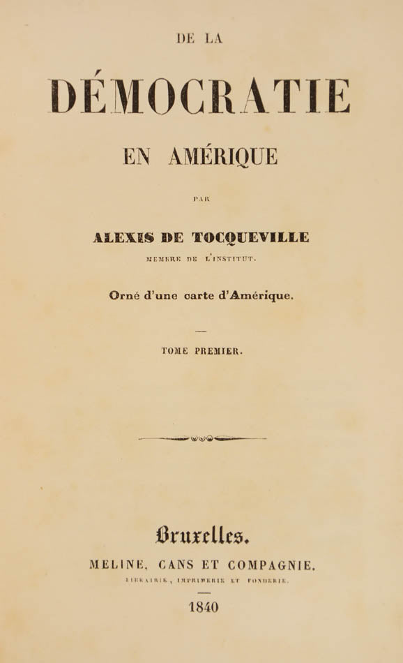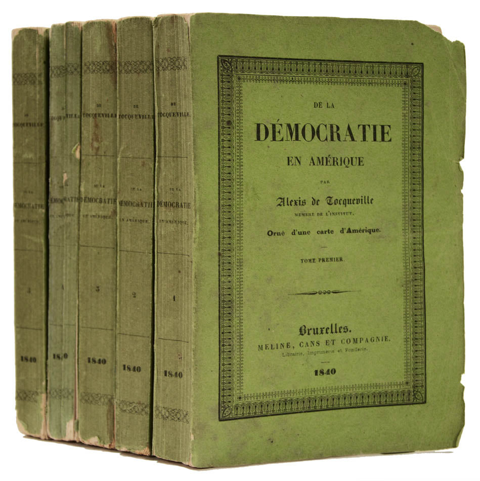 Second complete Brussels edition, in the scarce and appealing original wrappers, of de Tocqueville's magnum opus. The first appearances of De la démocratie en Amérique in Brussels were published by Louis Hauman in the same years as the first editions (Paris: Charles Gosselin, 1835 & 1840). Meline also published a two volume set in 1840, but this, in five volumes, presented the work as complete.