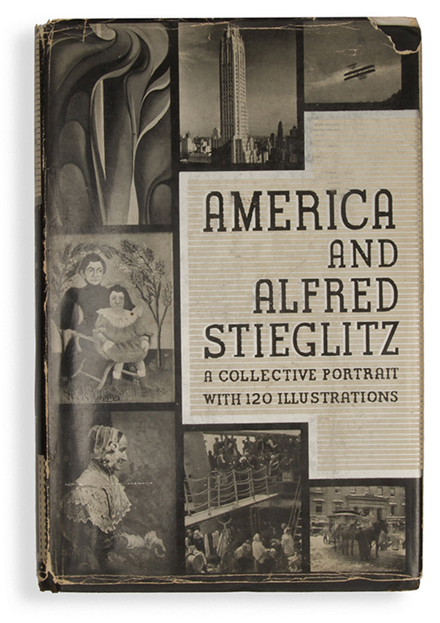 First edition, presentation copy with a lengthy inscription in black ink on the first page; 8vo (234 x 155 mm, 9¼ x 6 in); 64 pages of black & white plates; black topstain, plain endpapers, hinges cracked, black cloth-covered boards, titles in silver and design stamped to spine in blind, Stieglitz's monogram in blind to upper board, corners bumped, light wear to extremities, dust jacket illustrated with photographs and reproductions of artworks, printed in black and silver, text in black and white, chipped and worn, a very good copy; [ii], x, 339, [1]pp.