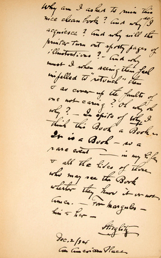 A presentation copy, inscribed to abstract realist painter De Hirsh Margules and his sister Annette, both active in Greenwich Village social circles:'Why am I asked to ruin this / nice clean book? And why do I / acquiesce? And why will the / printer turn out spotty pages of / illustrations? And why / must I when seeing them feel / impelled to "retouch" them / & or cover up the faults of / one not caring? Oh why oh / why? - In spite of why, I / think this Book a Book - / It is a Book - so a / rare event - in my life / & all the lives of those / who may see the Book / whether they know it or not. / [?]. For Margules - / him & her — / [signed] Stieglitz / Dec. 2 1934 / An American Place'.