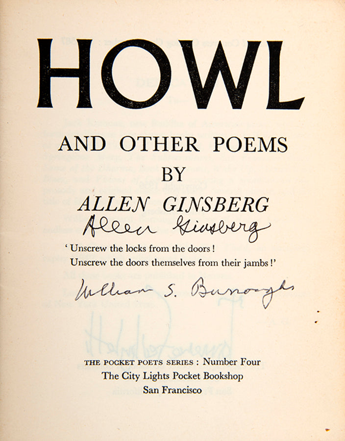 A remarkable copy of the most influential book of poetry published since the Second World War. Signed by the author on the title page, and additionally by William Burroughs, Lawrence Ferlinghetti (the publisher), and Carl Solomon (the poem's dedicatee).Whilst copies of later printings signed Ginsberg are far from rare, examples of the correct first issue with multiple signatures certainly are.