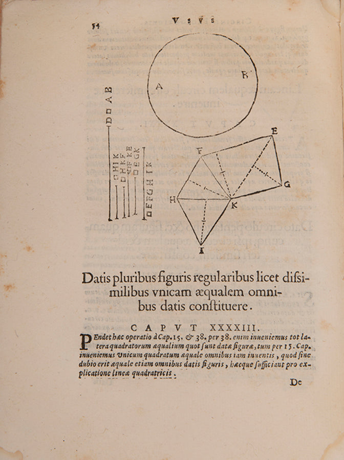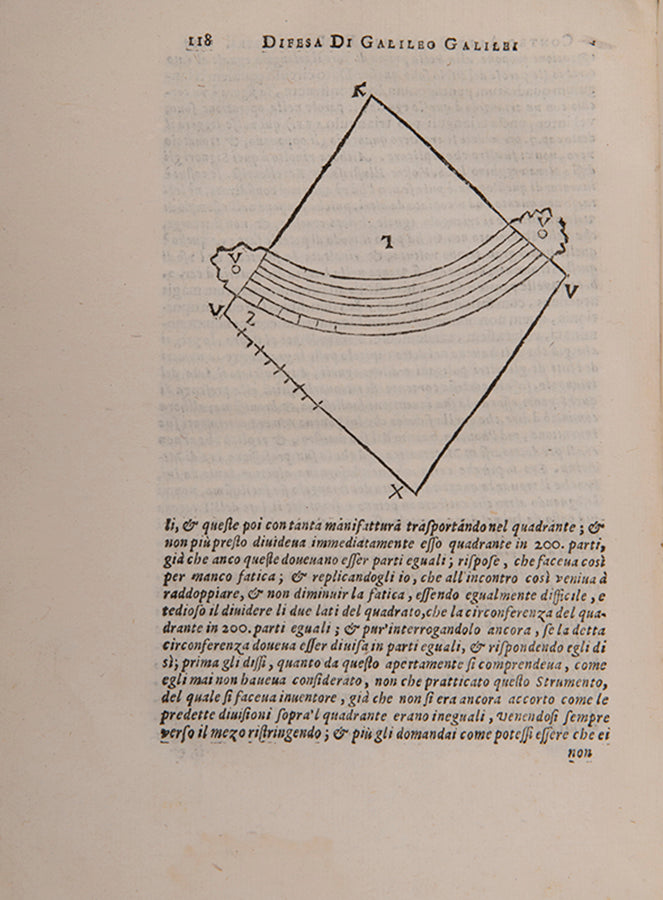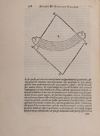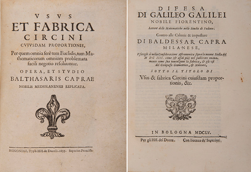 Two works extracted from the first volume of the 1655-1656 Dozza edition of Galileo's Opere, comprising Capra's (1580-1626) treatise on the use and construction of proportional compasses (signatures []4 A-K4) and Galileo's (1564-1642) resulting attack on Capra (L-V4). Illustrated throughout with woodcut diagrams and full-page tables.First published in 1607, Usus et fabrica was suppressed by the University of Padua following a complaint by Galileo that the work plagiarised his earlier Le operazioni del compasso geometrico militare (1606). The text essentially amounted to a Latin translation of this work, and the proportional compass Capra claimed to have invented in Usus had in fact been developed earlier in the sixteenth century, with important contributions made to its design by Galileo in the 1590s.