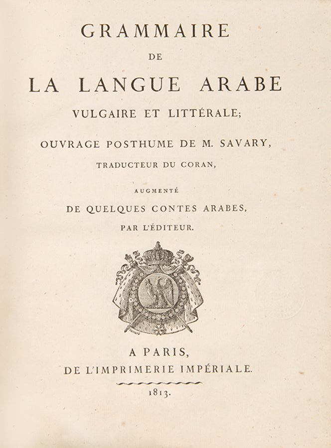 An important early French-Arabic grammar in a beautiful contemporary French binding.Savary had a vast knowledge of the Arabic language, which served him well on his travels. He was the first Frenchman to cite Arabic texts in his works on his journeys, and was a pioneer of Egyptology and translator of the Qur'an. Napoleon himself was at the forefront of French interest in Egypt and Arabia, and had planned to produce his own bible which incorporated parts of the Qur'an.