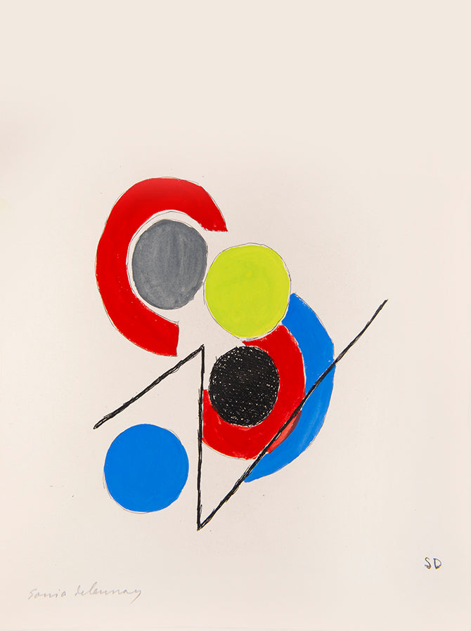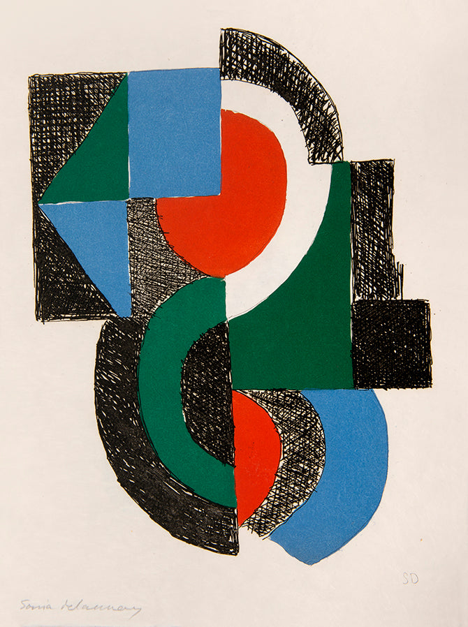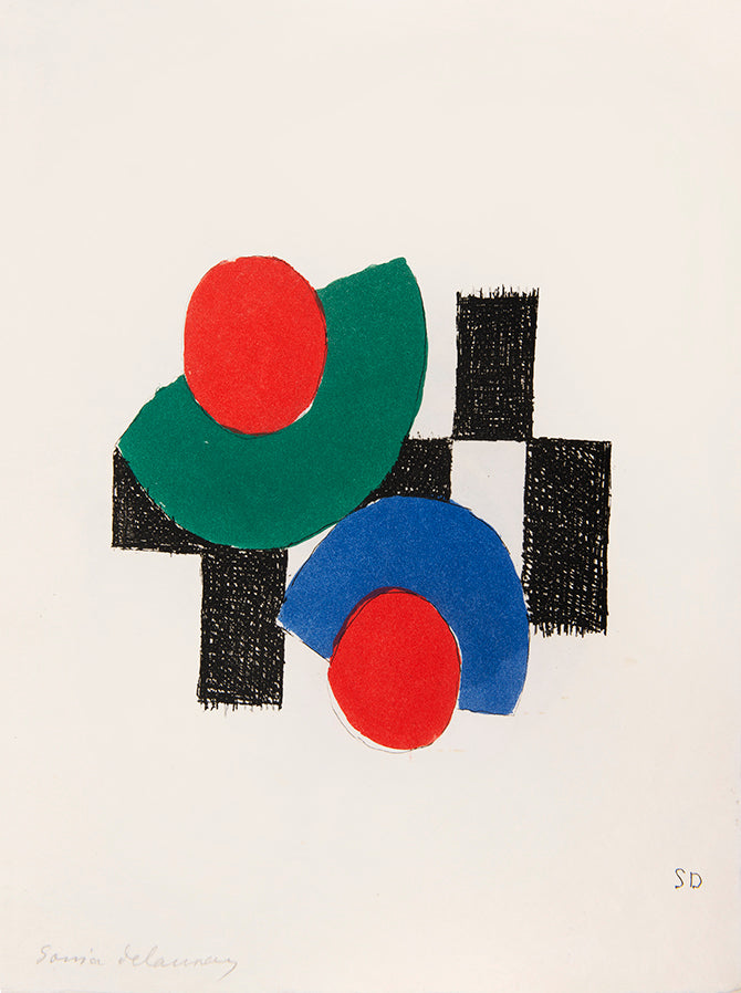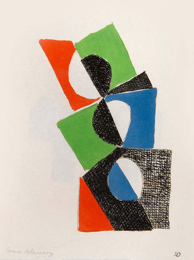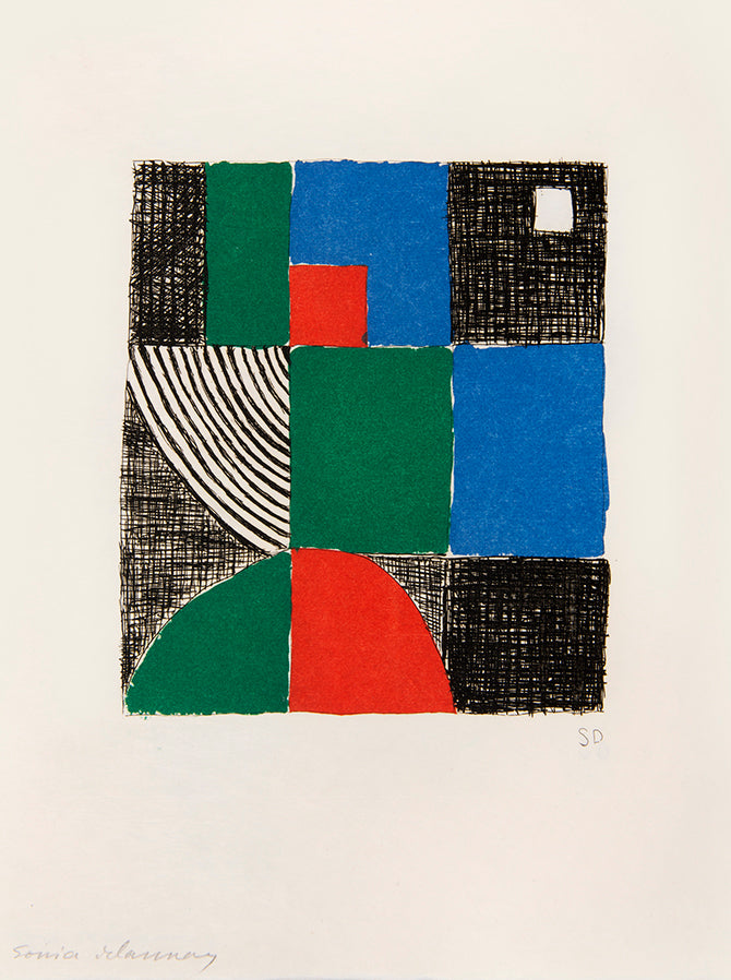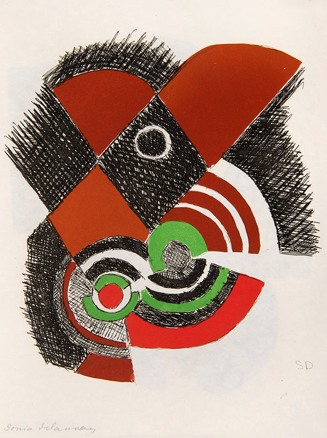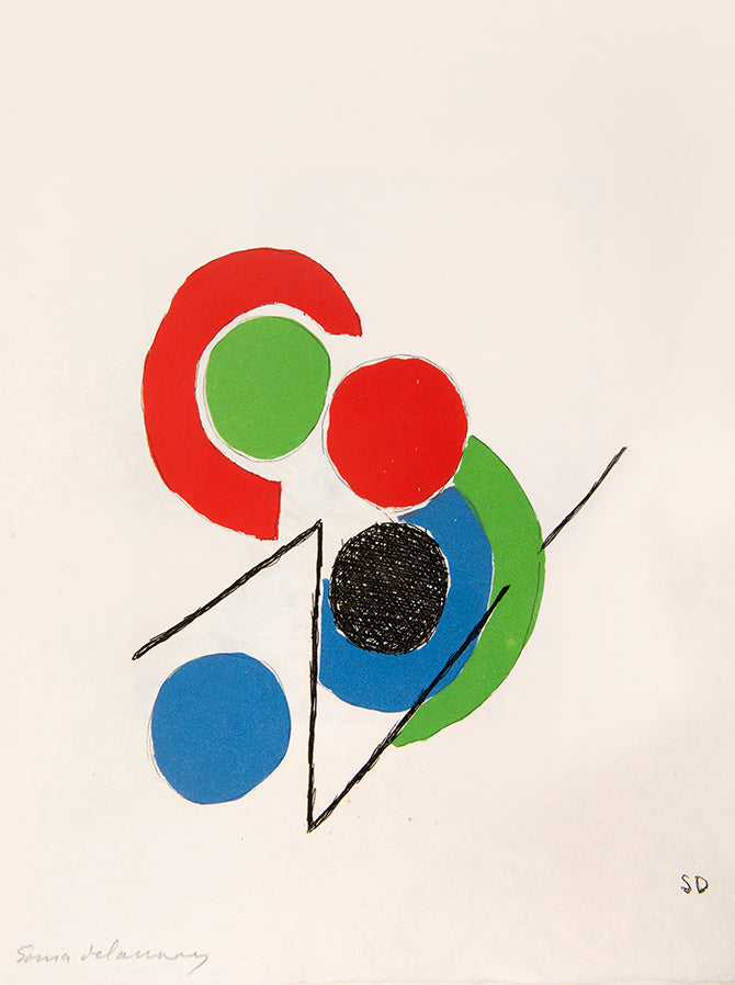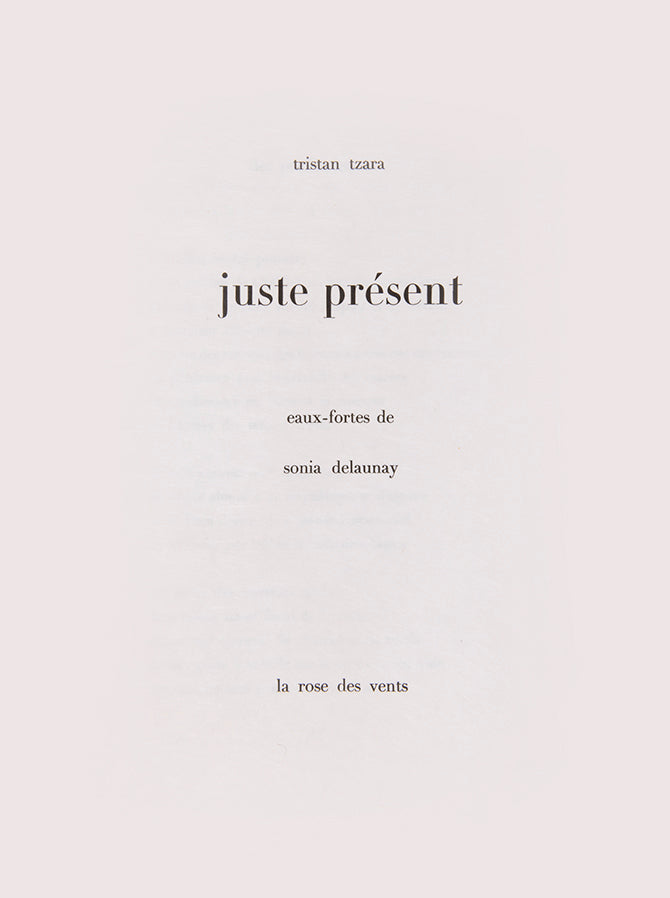 Juste Présent is a collection of Tristan Tzara's poems written between 1947 and 1950 with illustrations by his long-term collaborator and friend Sonia Delaunay. Published in 1961, a period where Delaunay returned to painting and printmaking with styles and techniques akin to the early years of her career. The bright, abstract forms which she had pioneered at the beginning of the century now appeared in a whole new dimension and for a new audience (she was by this point a national treasure in France). However, this was not simply regurgitating her previous art, as she said herself, 'abstract art is only important if it is the endless rhythm where the very ancient and the distant future meet'.