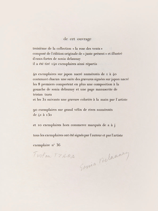 Limited edition, one of 40 examples on japon nacré, signed by the author and artist, from a total edition of 140, folio (38 x 28 cm); 8 etchings in colour after Delaunay, plus an extra suite in colour also on nacré with each plate signed in pencil, an additional signed etching hand-coloured in gouache by the artist, loose as issue, with tissue guards; in the original lithographed chemise and slipcase, a fine example.