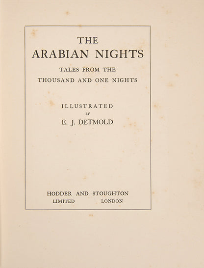A superlative copy of this opulent edition of The Arabian Nights, beautifully illustrated by Edward Julius Detmold (1883-1957), one of the most accomplished illustrators of the golden age of the deluxe illustrated book. Included here are the tales of Ali Baba and the Forty Thieves; Sinbad the Sailor and Aladdin and the Wonderful Lamp, amongst others. Scare in such fine condition and with the original box.