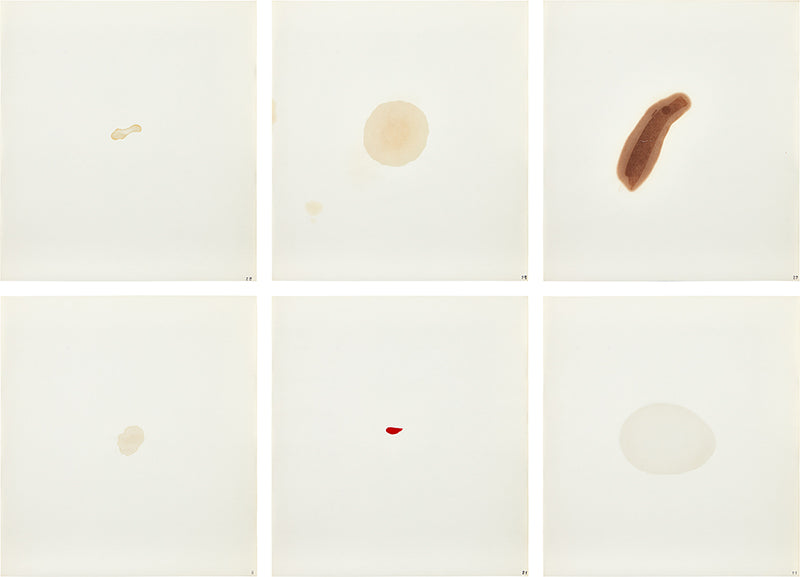 Limited edition, one of 70 copies, signed and numbered in blue ink on the colophon, and stamp-numbered in black ink on each plate, square 4to (each sheet: 29.8 x 27.3 cm, Portfolio: 31.8 x 28.6 x 3.8 cm); the complete portfolio of 76 stains (Mixed Media), on Eagle Coupon Bond paper, including the additional stain on white silk moiré fabric boxed in the portfolio, with title, colophon and index pages, all loose as issued, contained in the original clamshell portfolio covered with black textured paper with embossed title in silver ink on the cover and spine.
