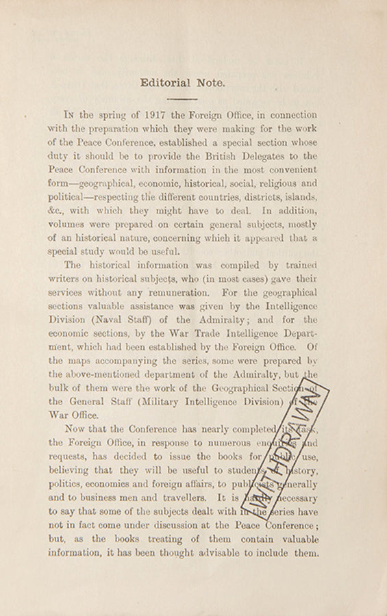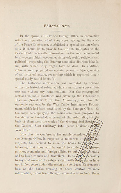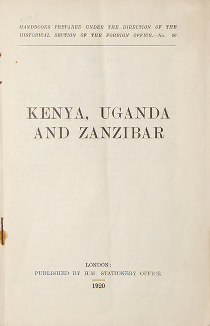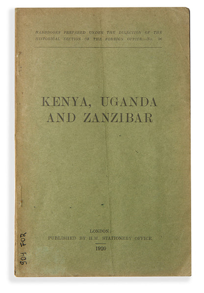 This series of handbooks was originally drawn up in 1917 for the British Delegates who would attend the Paris Peace Conference to give them helpful information on whichever nation they would treat with. The text of the handbook was not altered to reflect the 1920 changes, but the title and wrappers were altered to reflect the change in status of Kenya and the obsolescence of the East Africa Protectorate name.