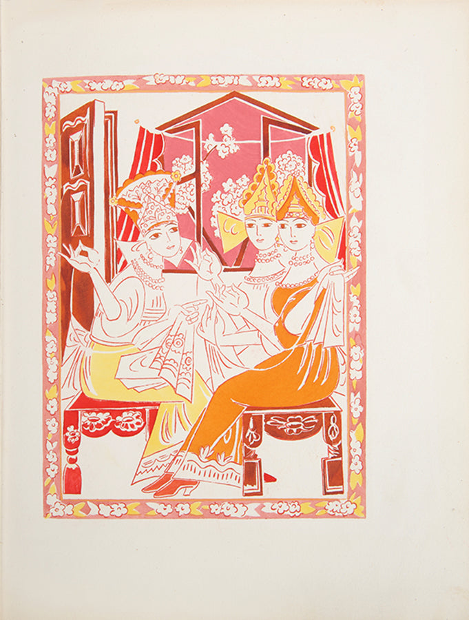 Goncharova was also inspired by lubki, cheaply produced popular prints which were hand-coloured with diluted tempera. Their bold lines, flattened figures and high-contrast bright colours attracted Goncharova and other avant-garde artists for their 'primitive' nature. Especially now exiled in Paris she was keen to establish an eastern lineage to her style, having said before 'now I shake the dust from my feet and leave the West, considering its vulgarising significance trivial and insignificant – my path is towards the source of all arts, the East. The West has taught me one thing: everything it has is from the East'.
