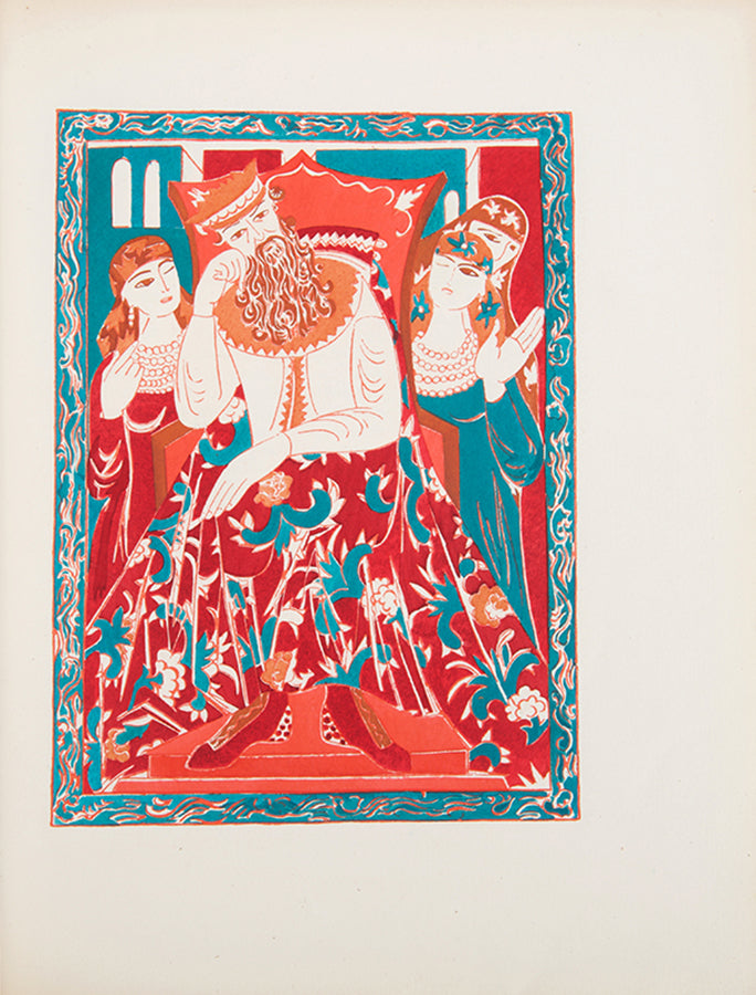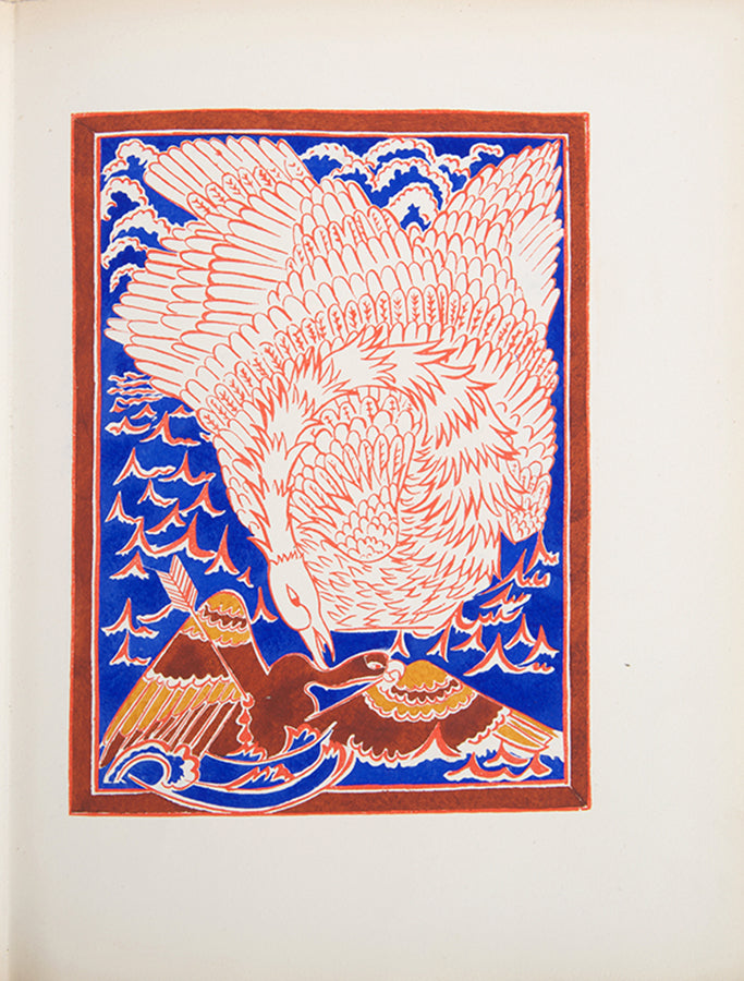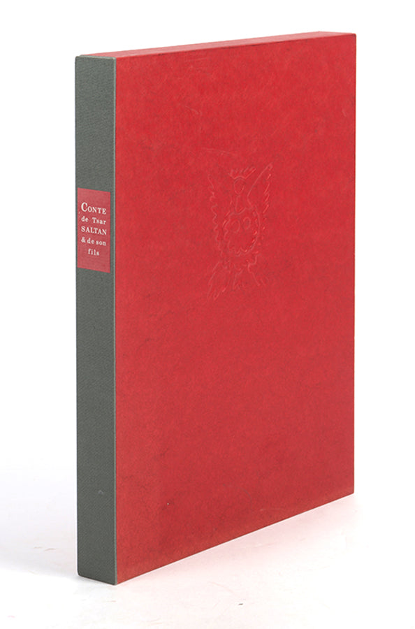 Limited edition, one of 529 numbered copies on papier velin, this numbered 411, from a total edition of 599, 4to (29.7 x 23 cm); 48pp., 10 full-page illustrations and 6 carpet pages, decorative borders and ornamental initials throughout, all after designs by Goncharova hand coloured by pochoir, leaves loose as issued and cut; in the original lithographed portfolio with floral paper lining, without the fabric tie, spine faded, in a modern red box with grey cloth spine, label to spine and sirin embossed to upper cover, a near fine copy.