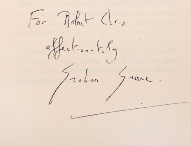 Wormold is a vacuum cleaner salesman in a city of power cuts. His adolescent daughter spends his money with a skill that amazes him, so when a mysterious Englishman offers him an extra income he is tempted. In return, all he has to do is carry out a little espionage and file a few reports; however, matters suddenly grow more complicated and Havana becomes a threatening place.First edition, first impression, signed presentation inscription by the author; 8vo; bookplate to front free endpaper, inscription from the author to title, 'For Robert Chris/ affectionately/ Graham Greene', internally clean; publisher's blue cloth, a touch of rubbing, a few gatherings strained, unclipped illustrated dust-jacket by Donald Greens, a little wear to extremities, otherwise a near-fine copy.