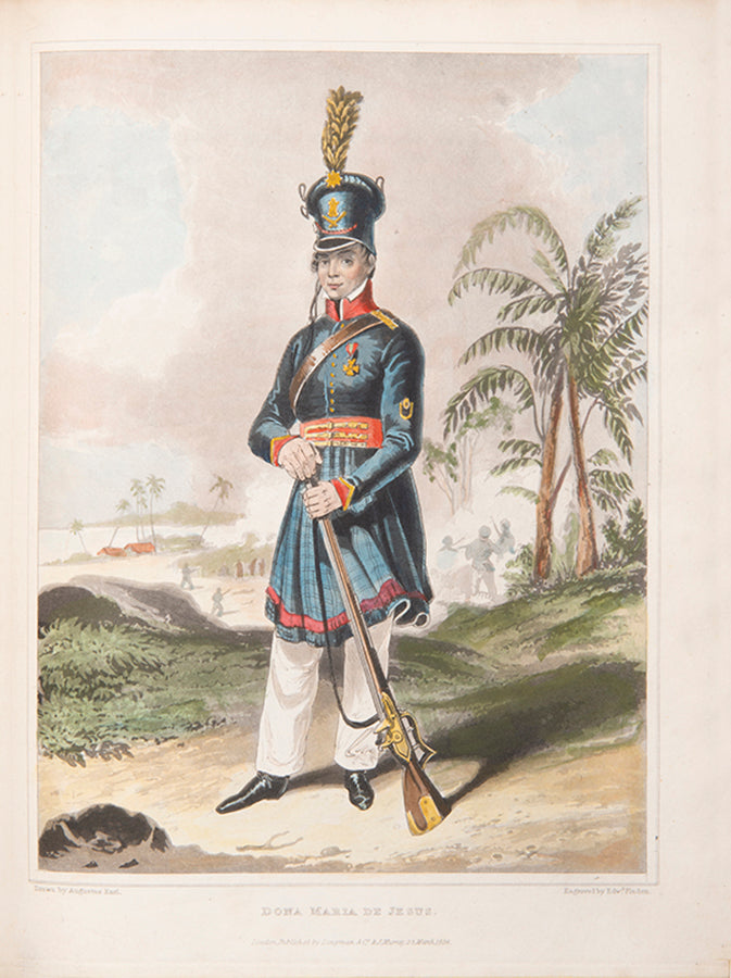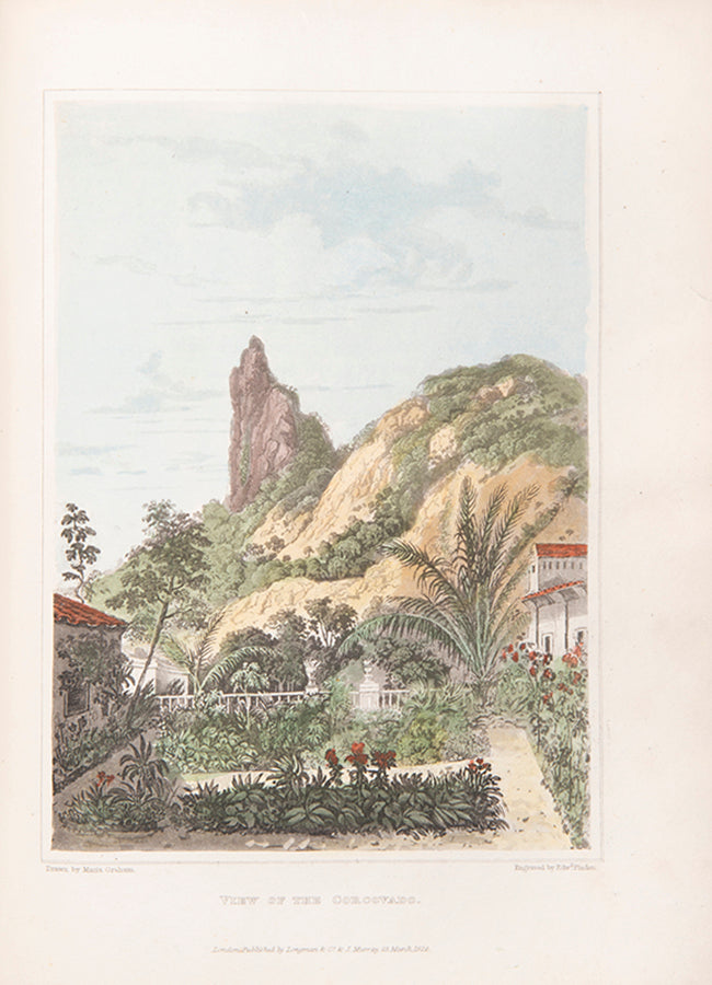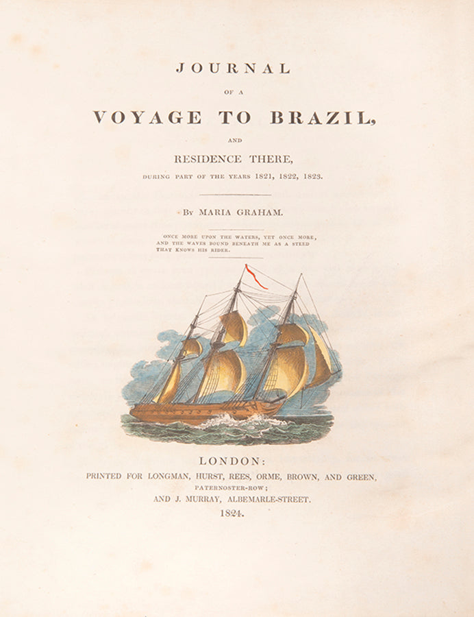 Graham was an accomplished painter, moving in the same circles as Constable and Turner, and took for her second husband the landscape painter Sir Augustus Wall Callcott. She drew most of the plates in this work herself, mixing landscapes with views of Brazilian slave markets, and dedicated a section to Maria Quitéria, a national heroine who disguised herself in soldier's clothes to fight in the war of independence, for whom the engraving in this work remains the standard depiction.