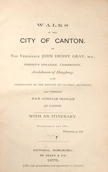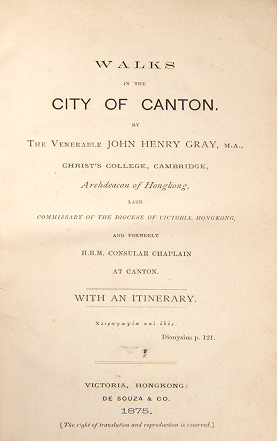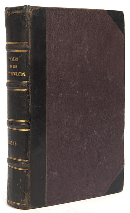 John Henry Gray's (1823-1890) scarce guide-book of Canton. The work is structured into seven distinct walks around the city, with extensive detail and history on the sights and landmarks encountered on each route. Reverence and respect for the history of China and its people comes through clearly in the veneration given to the monuments and temples described. Gray is also singular for including the hustle and bustle of the city in his routes as well as the great landmarks, taking the reader through the streets of furniture makers, glassblowers, silk weavers, the ponds of fish breeders, rice paper art studios, markets and foundries, and even local restaurants. Gray spent nearly 30 years in China and was Archdeacon of Hong Kong for a decade, and wrote several works on Chinese people and customs that helped combat a lot of negative stereotypes pervasive in Britain at the time.