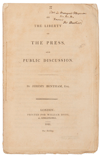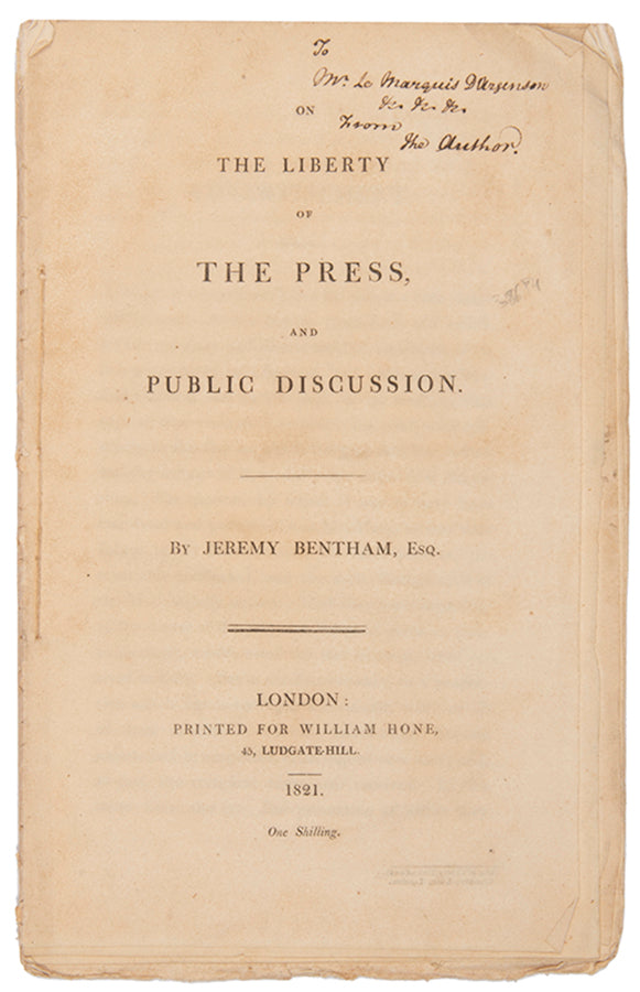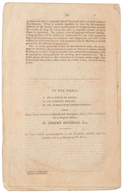 Bentham (1748-1832) planned the essay in response to laws passed by the Cortes of Spain during the brief rule of the Trienio Liberal, which limited freedom of speech and discussion, and led to the arrest of his Spanish translator José Joaquín de Mora. Bentham's hopes to help codify Spanish law during this period of liberal revival were dashed in 1823 with the Bourbon-led invasion of Spain and subsequent restoration of Ferdinand VII to absolute rule.