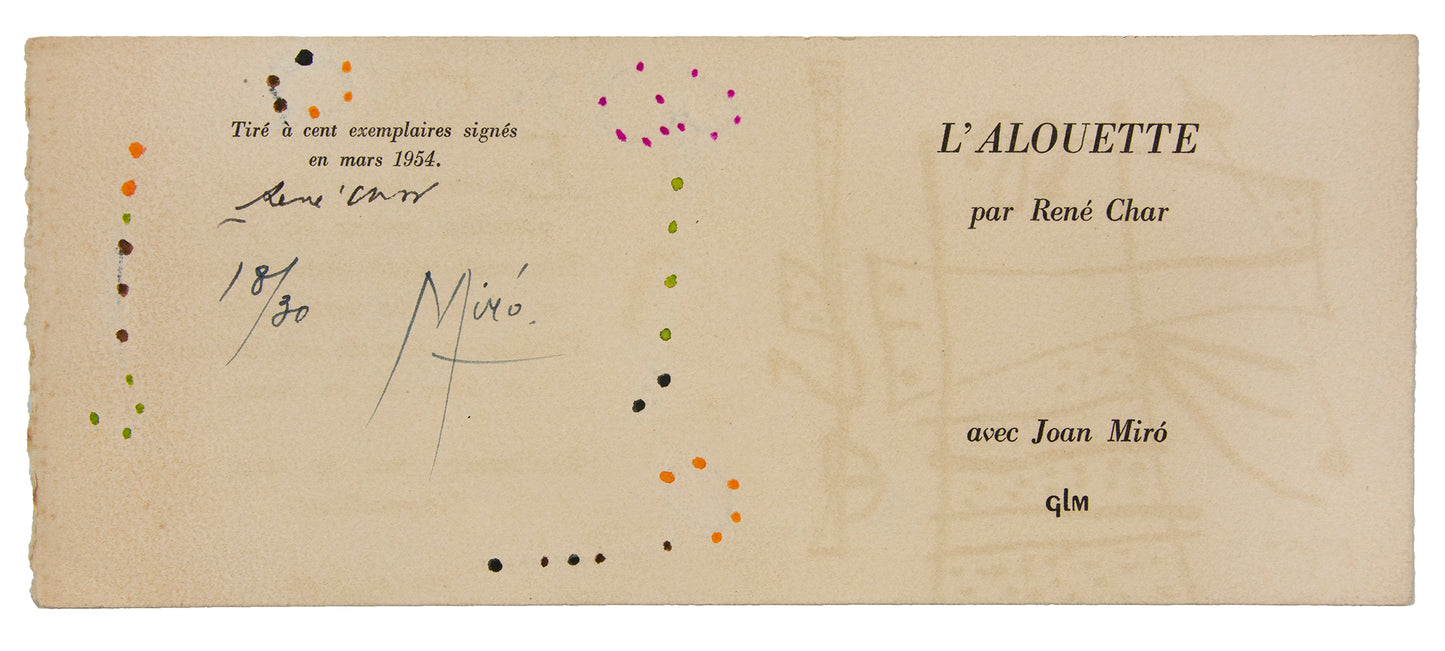 René Char and Joan Miro had met during the Surrealist period, but their friendship dated from the post-war years when Miro returned to France. L'Alouette is their third collaborative work. A notably scarce work even for unsigned examples both on the market and institutionally. There are only two copies in libraries, at Yale University and the Bibliothèque nationale de France.