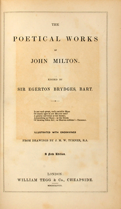 Illustrated with 7 steel-engraved plates after original drawings by J.M.W Turner, which were produced for Macrone's edition of Milton's works published in 1835.