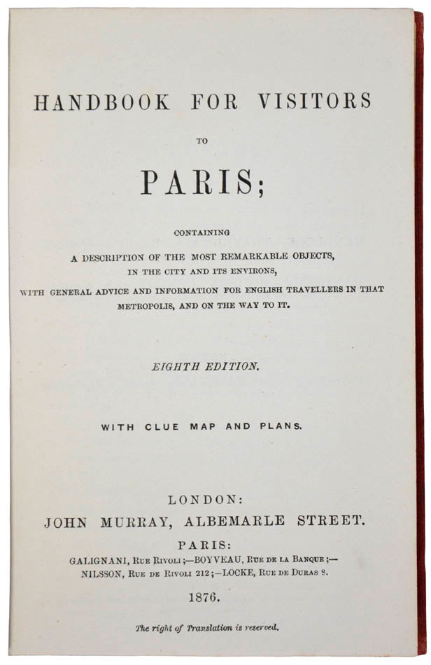 Eighth edition. vi,, 278 pp, 15 pp adverts dated 1877-78 at rear, 16 maps and plans, bookplate ; publisher's red cloth gilt, upper cover marked slightly ; overall a very good copy