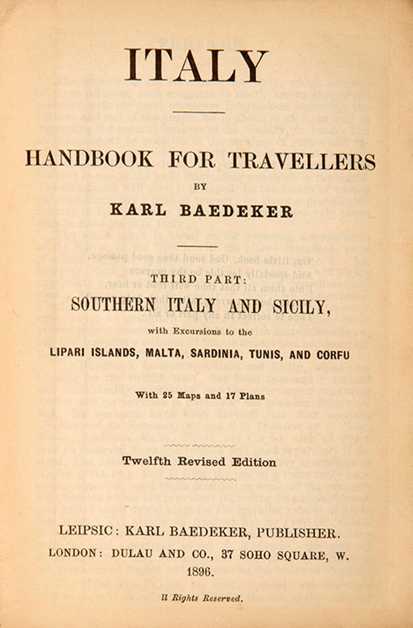 Twelfth edition, xlviii, 416pp., 25 maps & 17 plans, previous owner's booklabel and ink signature on front free endpaper, pages very slightly browned; publisher's red cloth gilt, spine faded and slightly marked; a very good copy.