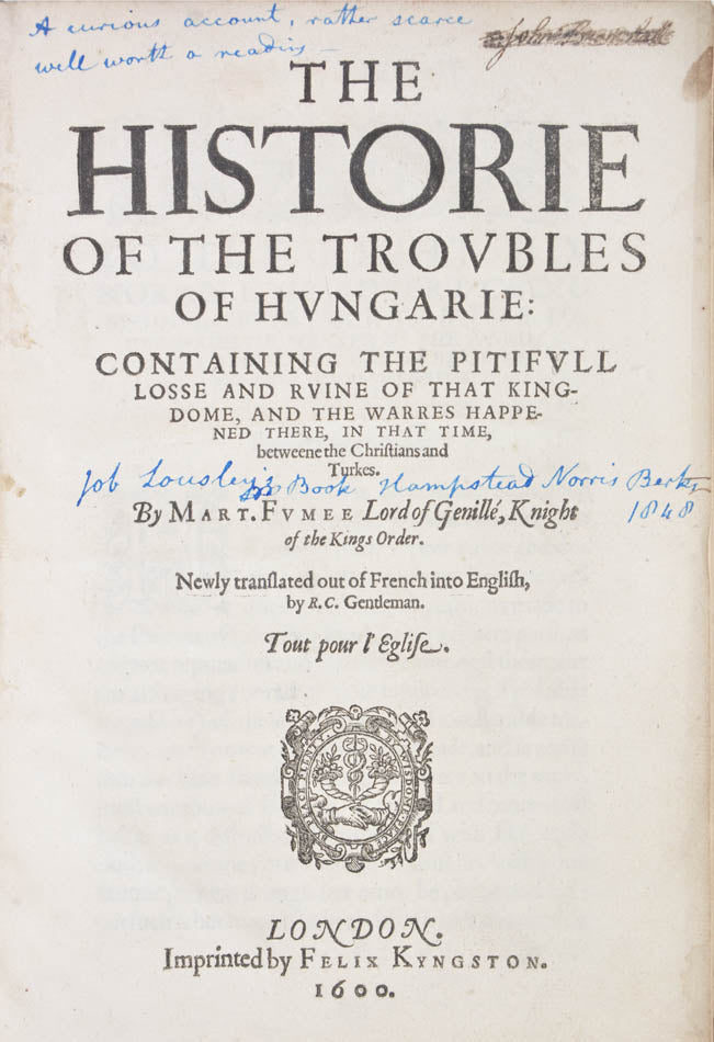 First edition in English. The first edition in English of Fumée's Histoire des troubles de Hongrie (1594). In his address to the reader, the translator Rooke Churche notes that he himself 'had been a travailer in this countrie of Hungarie', commenting that having 'translated some few notes out of this excellent Historie, I was requested by some of my good friends to take further paines in the whole'.