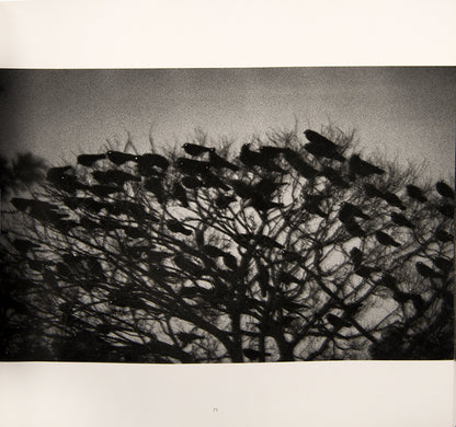 In 1971, Fukase began to make regular trips back to Hokkaido to visit his family. In 1975, with his marriage to Yohko under increasing strain, Fukase made the journey from Tokyo to Hokkaido by train, finding himself drawn to the flocks of ravens which he saw and photographed through the train window. He and Yohko divorced the following year, and Fukase spent much of the following decade working on this series in Hokkaido, Kanazawa, and Tokyo.