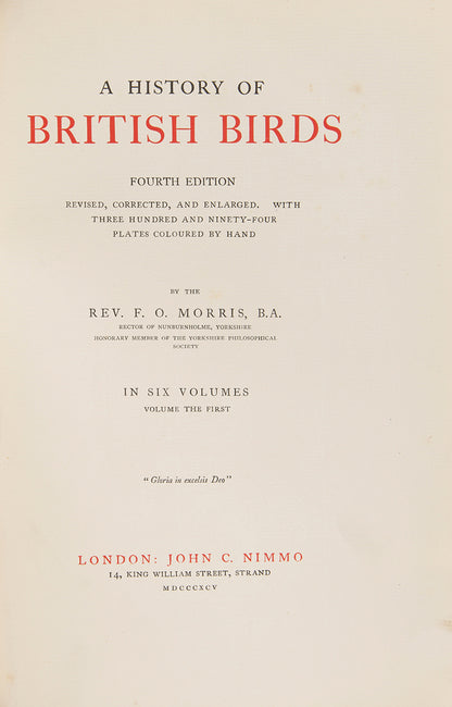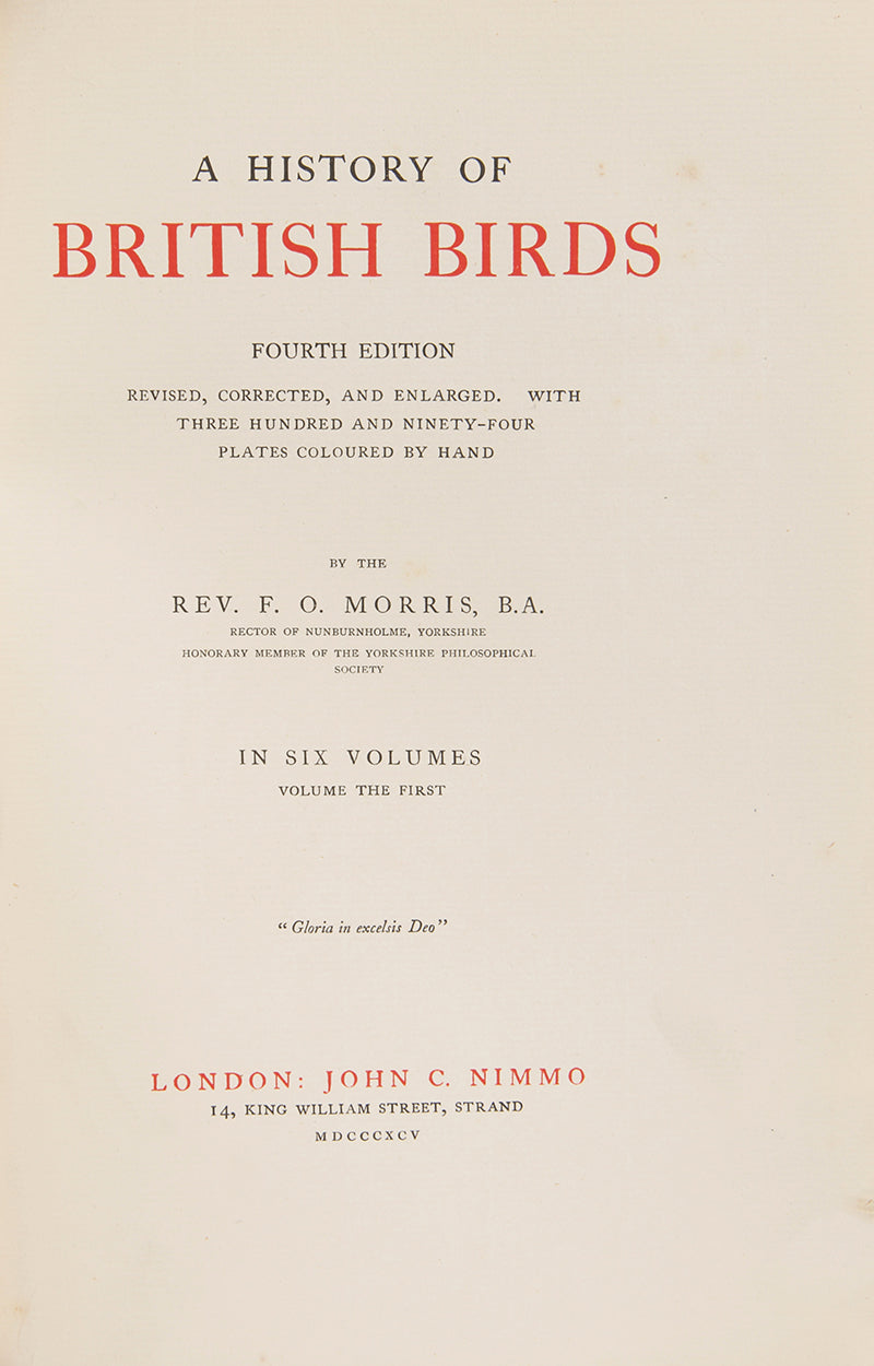 Orpen was dogged in his attempt to update these books as new species were added to the British lexicon, with a fifth edition following this one a few years later. He stated that another one of his goals was to make these books readable, and also financially accessible to every class that wished to study Natural History. 'He also supported the causes of bird protectionism and anti-vivisectionism—in a rare absence from his parish he travelled to London to give evidence before the select committee on wild birds protection on 26 June 1873. He was instrumental in establishing the Plumage League in 1885, and he was one of the earliest members of the Selbourne League, which was created in December of the same year. In 1888 the government acknowledged his work as a naturalist with the award of a civil-list pension of £100 per annum.' (Oxford Dictionary of National Biography).