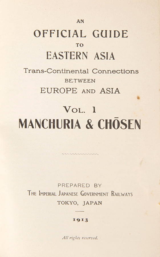 Imperial Japanese Railway Guide. This title was the first guide published in this comprehensive series. "The arrangement of the book follows the route of travel beginning at Western Europe and leading to Eastern Asia via the Siberian Railway." There were originally four titles published in this series; Vol 1 -Manchuria and Chosen, Vol II - South-Western Japan, Vol III - North-Eastern Japan, Vol IV - China. After 1920 there were two rarer volumes published - Vol V - East Indies and Vol VI - Hot Springs Japan were published. Chosen was the former name of Korea. This copy lacks three maps and these are as follows: 1) the map of Eastern Asia, 2) Map of Trans-Continental Routes between Asia and 3) Europe and Manchuria and Chosen. It is still a collector's piece.