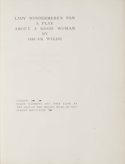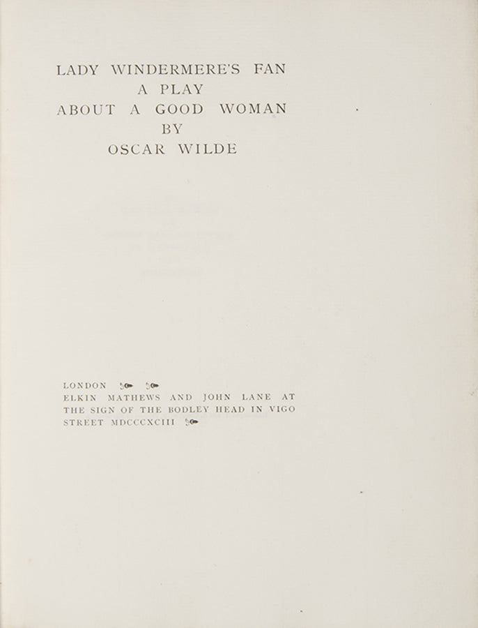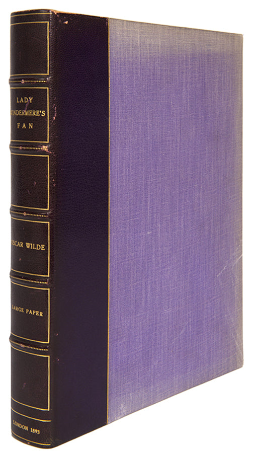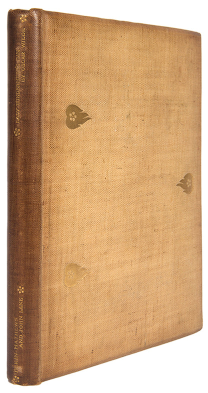 One of 50 large paper copies of Wilde's four-act comedy, first performed on Saturday, 20 February 1892, at the St James's Theatre in London. Like many of Wilde's plays, it bitingly satirises the morals of society.First edition, one of 50 large paper copies; small 4to (23 x 18 cm); ownership signature to limitation page, some browning to endpapers; publisher's straw coloured buckram with gilt decorations by Charles Ricketts, gilt lettering to spine, spine browned, very slight wear at head and foot of spine; a near-fine copy, housed in custom purple cloth chemise and matching quarter morocco slipcase.