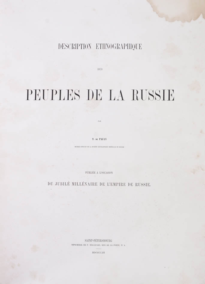 Dedicated to Alexander II and published to commemorate the thousand-year jubilee of the Russian Empire - the founding of the dynasty of Novgorod by the three Rus princes, Rurik, Sineus and Truvor - Pauly's book is suitably magnificent in size and scope, with plates of a consistently high artistic and technical quality. Descriptions of the varied inhabitants of the Empire are divided in parts between the Indo-Europeans, the Caucasians, the Uralo-Altaic nations, eastern Siberians and the short final section covers the 'peuples de l'Amerique russe'. The text is one of the most scholarly of the period.