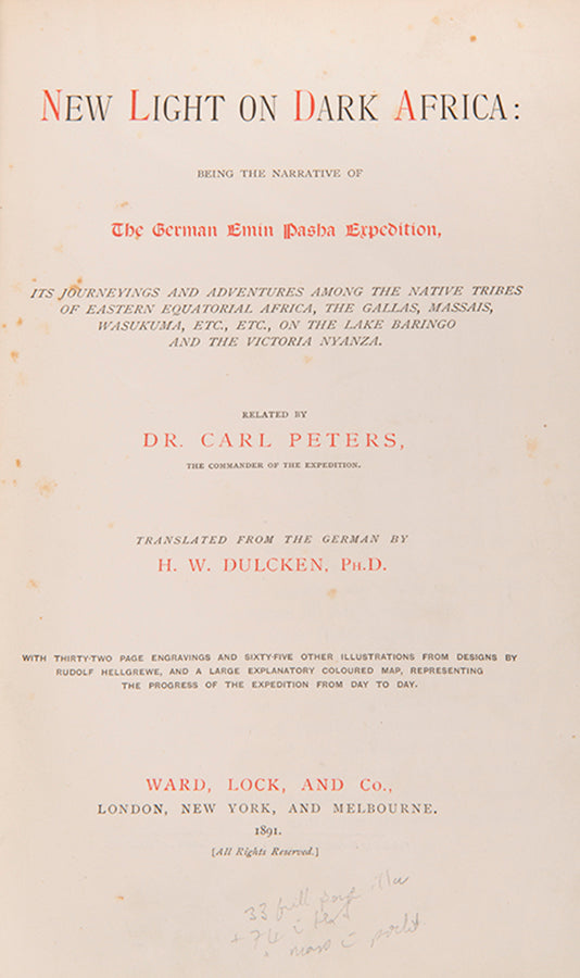 A German counterpart to Stanley's In Darkest Africa. 'A German counterpart to Stanley's In Darkest Africa, this represents Peter's journey to find Emin Pasha on the Upper Nile, but approaching from Africa's east coast... This work is wonderfully illustrated, particularly regarding the battles waged between the expedition and hostile tribes' (Czech). Peters followed Pigott in exploring the Tana River and gained notoriety by his political activities to secure influence in the interior. This roused the British, in an effort to counteract his activities, to explore both Kenya Colony and Uganda.