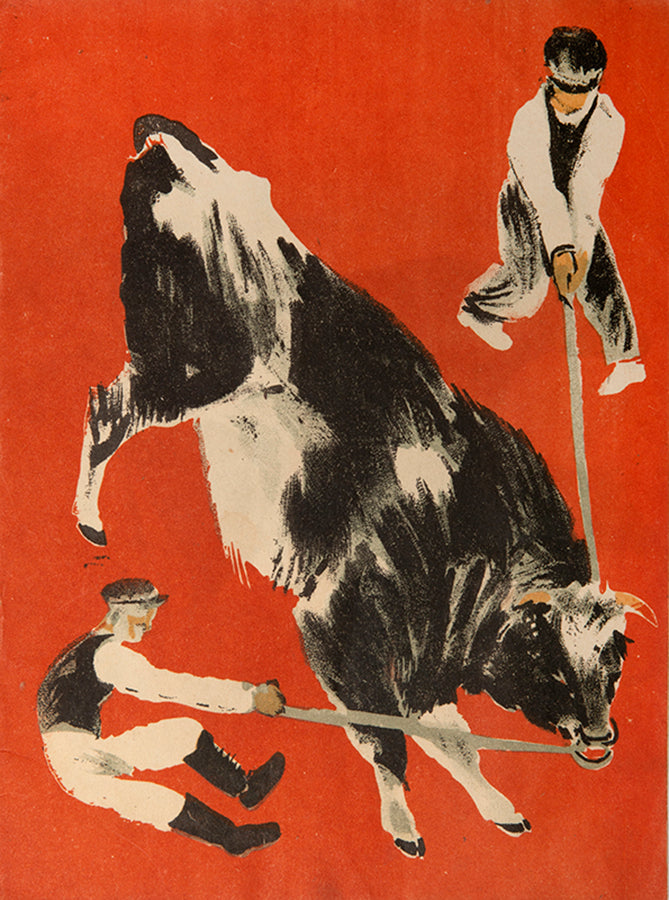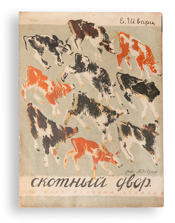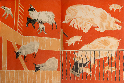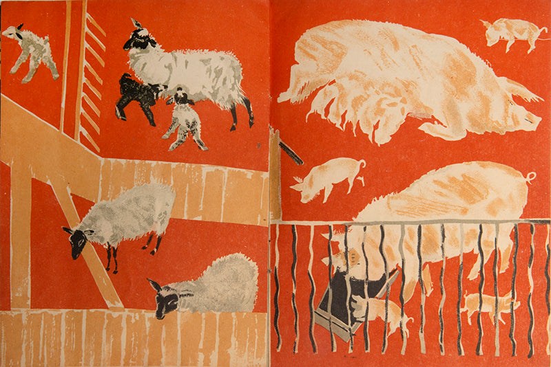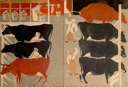 Propaganda for Soviet children on the advances of industrial agriculture and collectivisation. A very fresh example.Teodor Pevzner (1904-1942) studied at Vkhutemas before turning to children's book design. For The Farmyard he uses staggered perspective and bright contrasting colours to create vivid scenes of cows being milked, horses in their stables and children playing with animals in a fashion befitting his avant-garde training.