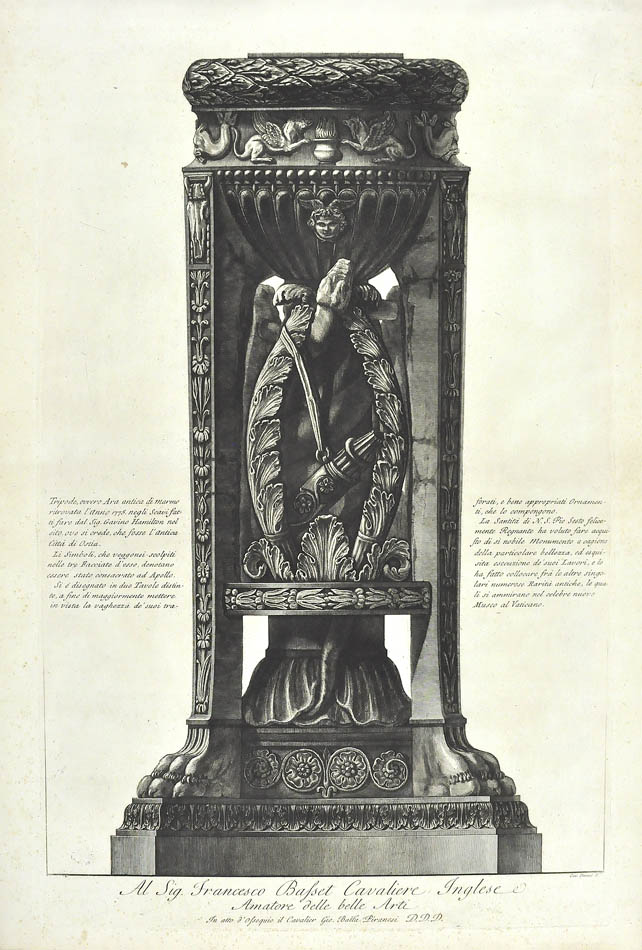 The plates were issued as individual plates from 1768, first appearing in bound form in 1778 as 'Vasi Candelabri Cippi Sarcofagi', probably compiled by Francesco Piranesi following his father's death. This set comprises Vasi antichi di marmo, Vaso inerario, Vasi Signor Corbet and Vasi Carmathen.