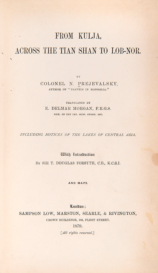 Account of Prejevalsky's second expedition originally published in Russian in 1877.Travelling through East Turkestan through the Tian Shan in 1876–1877, he visited what he believed to be Qinghai Lake, which had reportedly not been visited by any European since Marco Polo. The expedition consisted of ten men, twenty-four camels, four horses, three tons of baggage and a budget of 25,000 roubles, but the expedition was beset by disease and poor-quality camels. In September 1877, the caravan was refurbished with better camels and horses, 72,000 rounds of ammunition and large quantities of brandy, tea and Turkish delight and set out for Lhasa, but did not reach its goal.