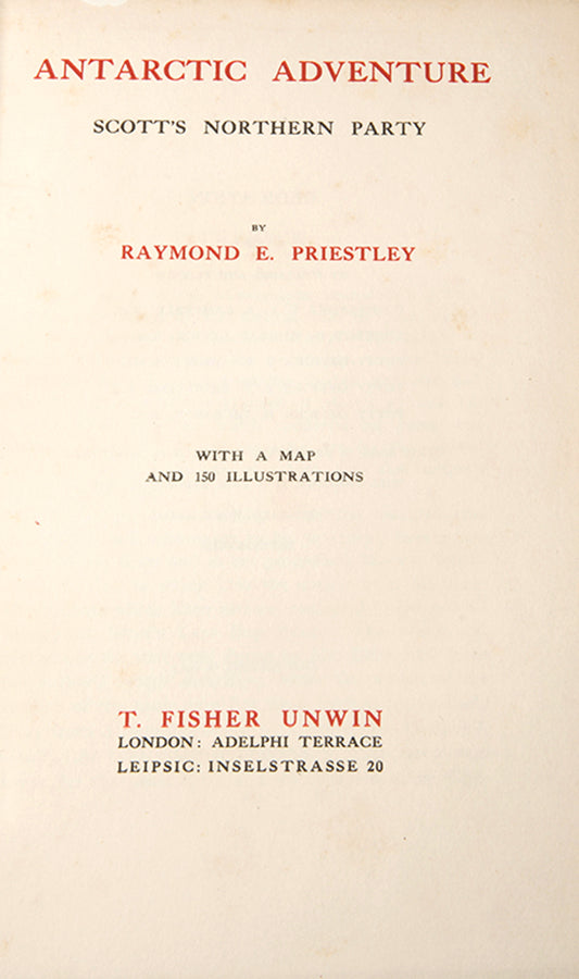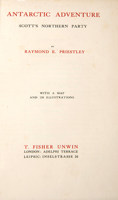 An account of Scott's Terra Nova expedition, here covering the wild adventures and amazing survival of the so-called Northern Party – an episode which may in our time achieve greater popularity than the dour tragedy of Scott's polar march. A letter from Priestley survives in which he says that many copies of this first printing were destroyed in a warehouse fire.